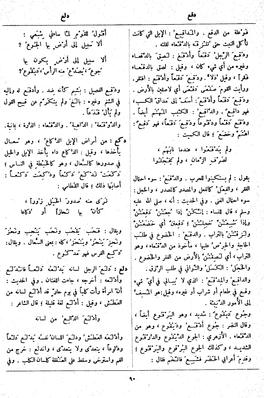؛ دَقِعْتنَّ أَي خَضَعْتُنَّ ولَزِقْتُنَّ بِالتُّرَابِ. والدقَعُ: الخُضوع فِي طلَب الحاجةِ والحِرْصُ عَلَيْهَا، مأْخوذ مِنَ الدَّقْعاء، وَهُوَ التُّرَابُ، أَي لَصِقْتُنَّ بالأَرض مِنَ الْفَقْرِ والخُضوع. والخَجَلُ: الكَسَلُ والتَّواني فِي طَلَبِ الرِّزق. والداقِعُ والمِدْقَعُ: الَّذِي لَا يُبالي فِي أَيّ شَيْءٍ وَقَعَ فِي طَعَامٍ أَو شَرَابٍ أَو غَيْرِهِ، وَقِيلَ: هُوَ المُسِفُّ إِلى الأُمور الدَّنِيئة. وجُوع دَيْقُوعٌ: شَدِيدٌ، وَهُوَ اليَرْقُوع أَيضاً، وَقَالَ النَّضْرُ: جُوع أَدْقَعُ ودَيْقُوع، وَهُوَ مِنَ الدَّقْعاء. الأَزهري: الْجُوعُ الدَّيْقُوع والدُّرْقُوع الشَّدِيدُ، وَكَذَلِكَ الْجُوعُ البُرْقوع واليَرْقُوع؛ وقدِمَ أَعرابي الحَضَر فشَبِعَ فاتّخَم فَقَالَ: