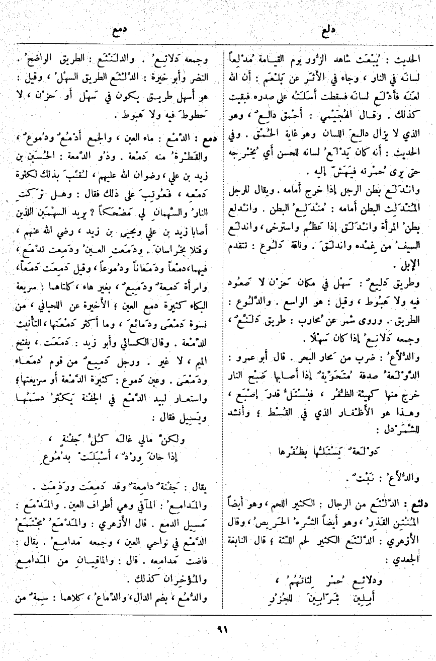 دمع: الدَّمْع: مَاءُ الْعَيْنِ، وَالْجَمْعُ أَدْمُعٌ ودُموعٌ، والقَطْرةُ مِنْهُ دَمْعة. وذُو الدَّمعة: الحُسَين بْنُ زَيْدِ بْنِ عَلِيٍّ، رِضْوَانُ اللَّهِ عَلَيْهِمْ، لُقِّبَ بِذَلِكَ لِكَثْرَةِ دَمْعِه، فَعُوتِبَ عَلَى ذَلِكَ فَقَالَ: وَهَلْ ترَكتِ النارُ والسَّهمان لِي مَضْحَكاً؟ يُرِيدُ السهْمَين اللَّذَيْنِ أَصابا زَيْدَ بْنَ عَلِيٍّ وَيَحْيَى بْنَ زَيْدٍ، رَضِيَ اللَّهُ عَنْهُمْ، وَقُتِلَا بخُراسانَ. ودَمَعتِ العينُ ودَمِعت تدْمَع، فِيهِمَا، دمْعاً ودَمَعاناً ودُموعاً، وَقِيلَ دَمِعَت دَمَعاً، وامرأَة دَمِعةٌ ودَمِيعٌ، بِغَيْرِ هَاءٍ، كِلْتَاهُمَا: سَرِيعَةُ الْبُكَاءِ كَثِيرَةُ دَمْعِ الْعَيْنِ؛ الأَخيرة عَنِ اللِّحْيَانِيِّ، مِنْ نِسْوَةٍ دَمْعَى ودَمائعَ، وَمَا أَكثر دَمْعَتها، التأْنيث للدَّمْعة. وَقَالَ الكسائي وأَبو زَيْدٍ: دَمَعَت، بِفَتْحِ الْمِيمِ، لَا غَيْرُ. وَرَجُلٌ دَمِيعٌ مِنْ قَوْمٍ دُمَعاء ودَمْعَى. وَعَيْنٌ دَموع: كَثِيرَةُ الدَّمْعة أَو سَرِيعَتُهَا؛ وَاسْتَعَارَ لَبِيدٌ الدَّمْع فِي الجفْنة يَكْثرُ دسَمُها ويَسِيل فَقَالَ: