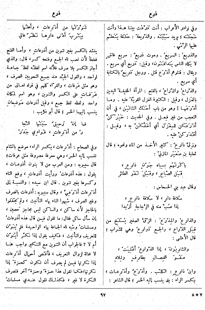 يُنْشَدُ بِالْكَسْرِ بِغَيْرِ تَنْوِينٍ مِنْ أَذرعاتِ، وأَما الْفَتْحُ فَخَطَأٌ لأَن نَصْبَ تَاءِ الْجَمْعِ وَفَتْحَهُ كَسْرٌ، قَالَ: وَالَّذِي أَجاز الْكَسْرَ بِلَا صَرْفٍ فلأَنه اسْمٌ لفظُه لفظُ جَمَاعَةٍ لِوَاحِدٍ، وَالْقَوْلُ الجيِّد عِنْدَ جَمِيعِ النَّحْوِيِّينَ الصَّرْفُ، وَهُوَ مِثْلُ عَرفات، وَالْقُرَّاءُ كُلُّهُمْ فِي قَوْلِهِ تَعَالَى مِنْ عَرَفاتٍ عَلَى الْكَسْرِ وَالتَّنْوِينِ، وَهُوَ اسْمٌ لِمَكَانٍ وَاحِدٍ وَلَفْظُهُ لَفْظُ جَمْعٍ، وَقِيلَ أَذرعات مَوضِعانِ يُنْسَبُ إِليهما الْخَمْرُ؛ قَالَ أَبو ذُؤَيْبٍ: