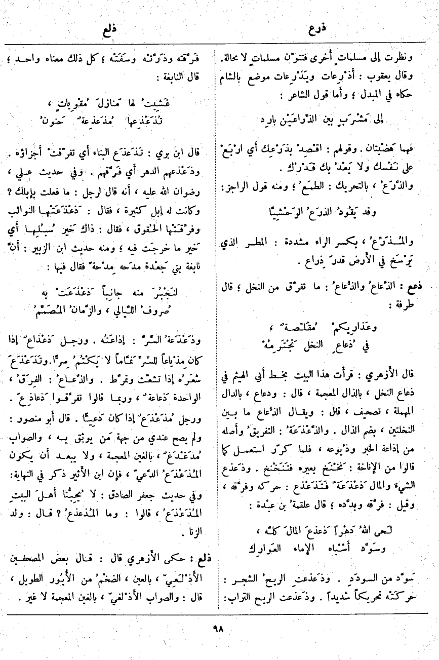 ذلع: حَكَى الأَزهري قَالَ: قَالَ بَعْضُ الْمُصَحِّفِينَ الأَذْلَعِيّ، بِالْعَيْنِ، الضخْمُ مِنَ الأُيُور الطَّوِيلُ، قَالَ: وَالصَّوَابُ الأَذْلغيّ، بِالْغَيْنِ الْمُعْجَمَةِ لَا غَيْرَ.