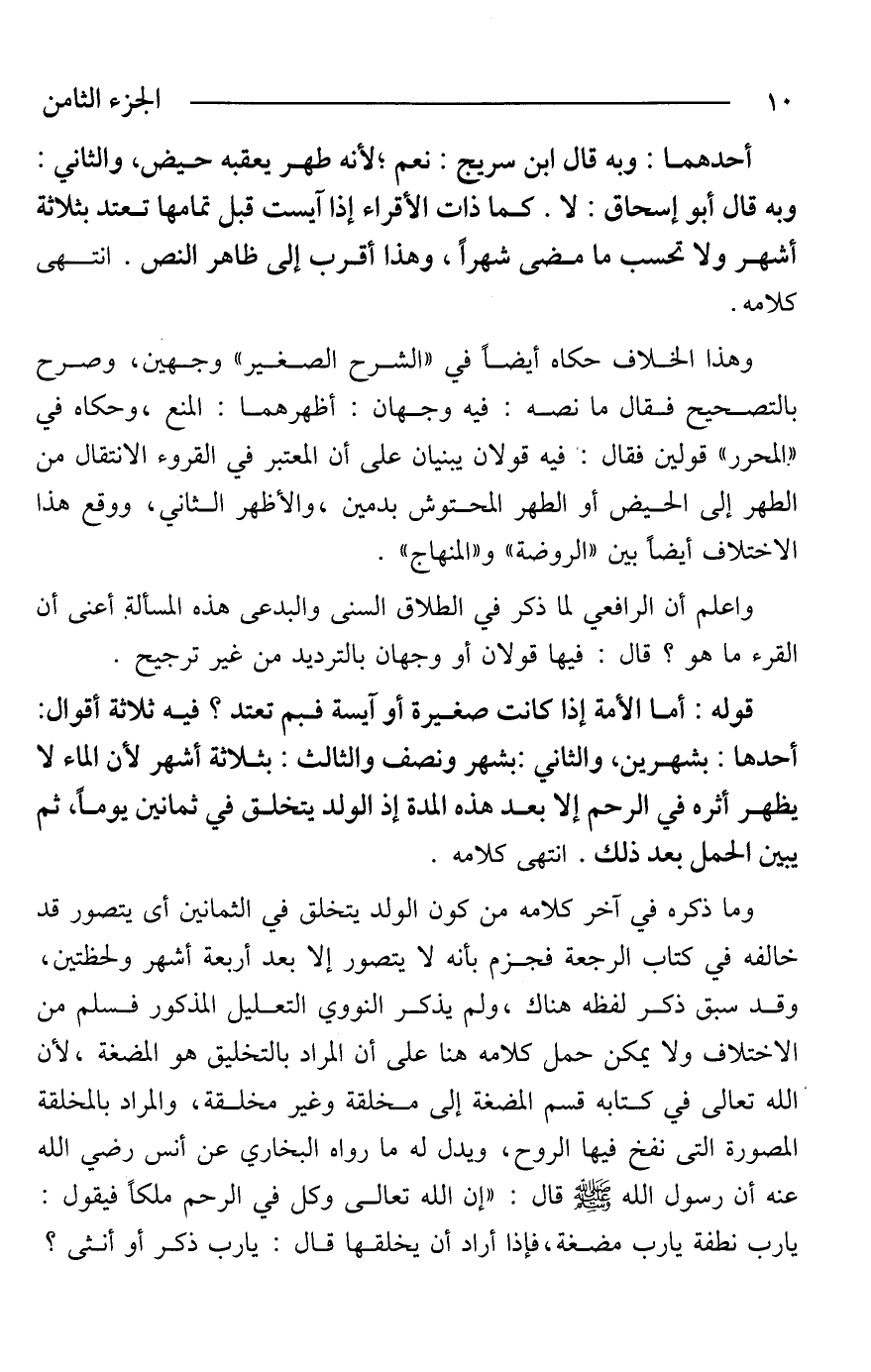 وما ذكره في آخر كلامه من كون الولد يتخلق في الثمانين أى يتصور قد خالفه في كتاب الرجعة فجزم بأنه لا يتصور إلا بعد أربعة أشهر ولحظتين، وقد سبق ذكر لفظه هناك، ولم يذكر النووي التعليل المذكور فسلم من الاختلاف ولا يمكن حمل كلامه هنا على أن المراد بالتخليق هو المضغة، لأن الله تعالى في كتابه قسم المضغة إلى مخلقة وغير مخلقة، والمراد بالمخلقة المصورة التى نفخ فيها الروح، ويدل له ما رواه البخاري عن أنس - رضي الله عنه - أن رسول الله - صَلَّى اللَّهُ عَلَيْهِ وَسَلَّمَ - قال: "إن الله تعالى وكل في الرحم ملكًا فيقول: يا رب نطفة يا رب مضغة، فإذا أراد أن يخلقها قال: يا رب ذكر أو أنثى؟