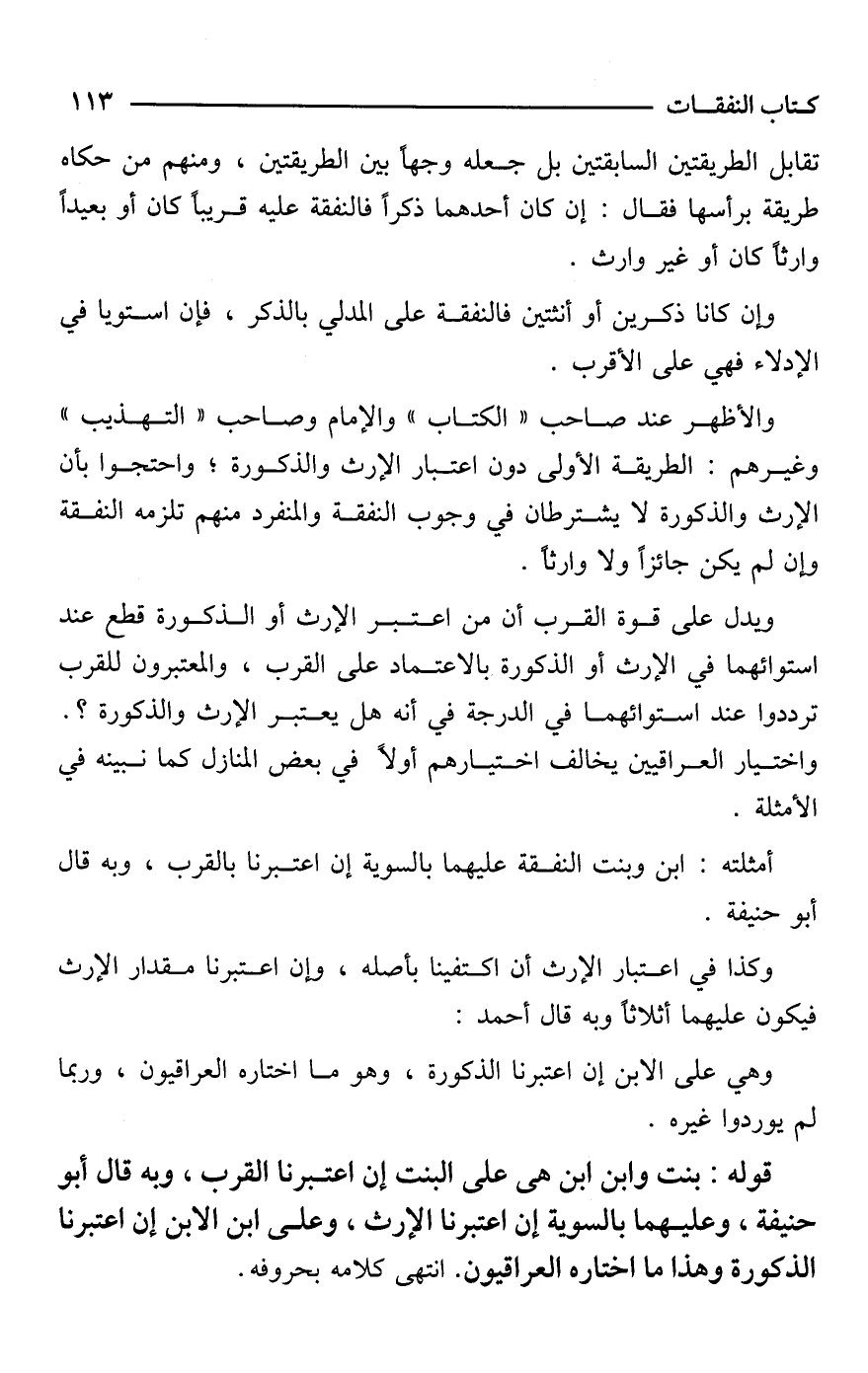 والأظهر عند صاحب "الكتاب" والإمام وصاحب "التهذيب" وغيرهم: الطريقة الأولى دون اعتبار الإرث والذكورة؛ واحتجوا بأن الإرث والذكورة لا يشترطان في وجوب النفقة والمنفرد منهم تلزمه النفقة وإن لم يكن جائزًا ولا وارثًا.