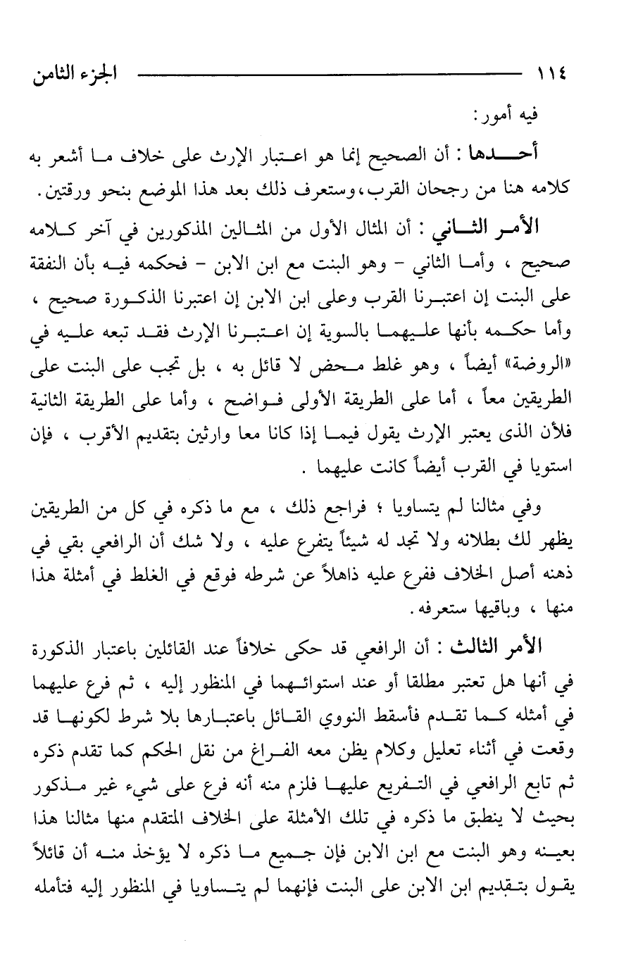 الأمر الثالث: أن الرافعي قد حكى خلافًا عند القائلين باعتبار الذكورة في أنها هل تعتبر مطلقا أو عند استوائهما في المنظور إليه، ثم فرع عليهما في أمثله كما تقدم فأسقط النووي القائل باعتبارها بلا شرط لكونها قد وقعت في أثناء تعديل وكلام يظن معه الفراغ من نقل الحكم كما تقدم ذكره ثم تابع الرافعي في التفريع عليها فلزم منه أنه فرع على شيء غير مذكور بحيث لا ينطبق ما ذكره في تلك الأمثلة على الخلاف المتقدم منها مثالنا هذا بعينه وهو البنت مع ابن الابن فإن جميع ما ذكره لا يؤخذ منه أن قائلًا يقول بتقديم ابن الابن على البنت فإنهما لم يتساويا في المنظور إليه فتأمله