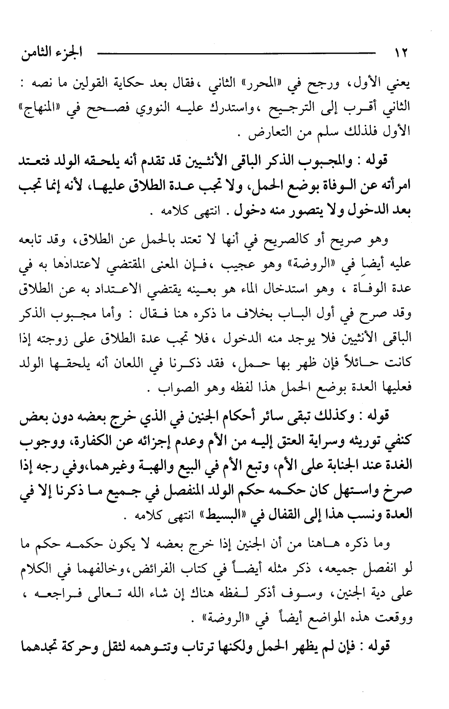 وهو صريح أو كالصريح في أنها لا تعتد بالحمل عن الطلاق، وقد تابعه عليه أيضا في "الروضة" وهو عجيب، فإن المعنى المقتضي لاعتدادها به في عدة الوفاة، وهو استدخال الماء هو بعينه يقتضي الاعتداد به عن الطلاق وقد صرح في أول الباب بخلاف ما ذكره هنا فقال: وأما مجبوب الذكر الباقى الأنثيين فلا يوجد منه الدخول، فلا تجب عدة الطلاق على زوجته إذا كانت حائلًا فإن ظهر بها حمل، فقد ذكرنا في اللعان أنه يلحقها الولد فعليها العدة بوضع الحمل هذا لفظه وهو الصواب.