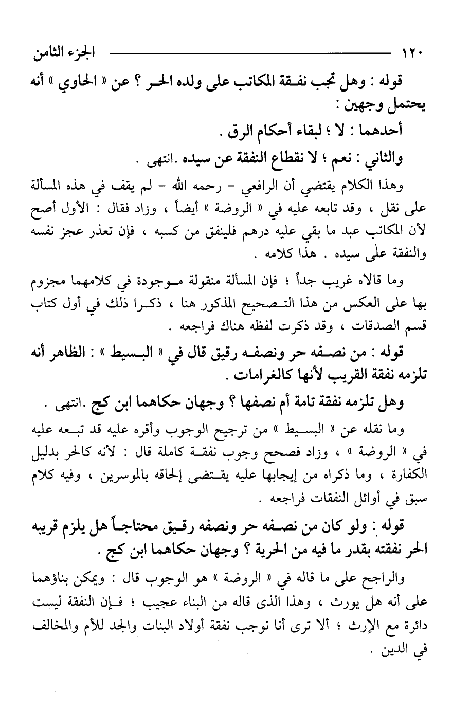 وما نقله عن "البسيط" من ترجيح الوجوب وأقره عليه قد تبعه عليه في "الروضة"، وزاد فصحح وجوب نفقة كاملة قال: لأنه كالحر بدليل الكفارة، وما ذكراه من إيجابها عليه يقتضى إلحاقه بالموسرين، وفيه كلام سبق في أوائل النفقات فراجعه.