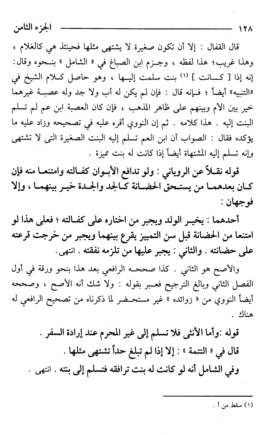 قال القفال: إلا أن تكون صغيرة لا يشتهى مثلها فحينئذ هي كالغلام، وهذا غريب؛ هذا لفظه، وجزم ابن الصباغ في "الشامل" بنحوه وقال: إنه إذا [كانت] (¬1) بنت سلمت إليها، وهو حاصل كلام الشيخ في "التنبيه" أيضًا؛ فإنه قال: فإن لم يكن له أب ولا جد وله عصبة غيرهما خير بين الأم وبينهم على ظاهر المذهب، فإن كان العصبة ابن عم لم تسلم البنت إليه. هذا كلامه. ثم إن النووي أقره عليه في تصحيحه وزاد عليه ما يؤكده فقال: الصواب أن ابن العم تسلم إليه البنت الصغيرة التى لا تشتهى وإنه تسلم إليه المشتهاة أيضًا إذا كانت له بنت مميزة.