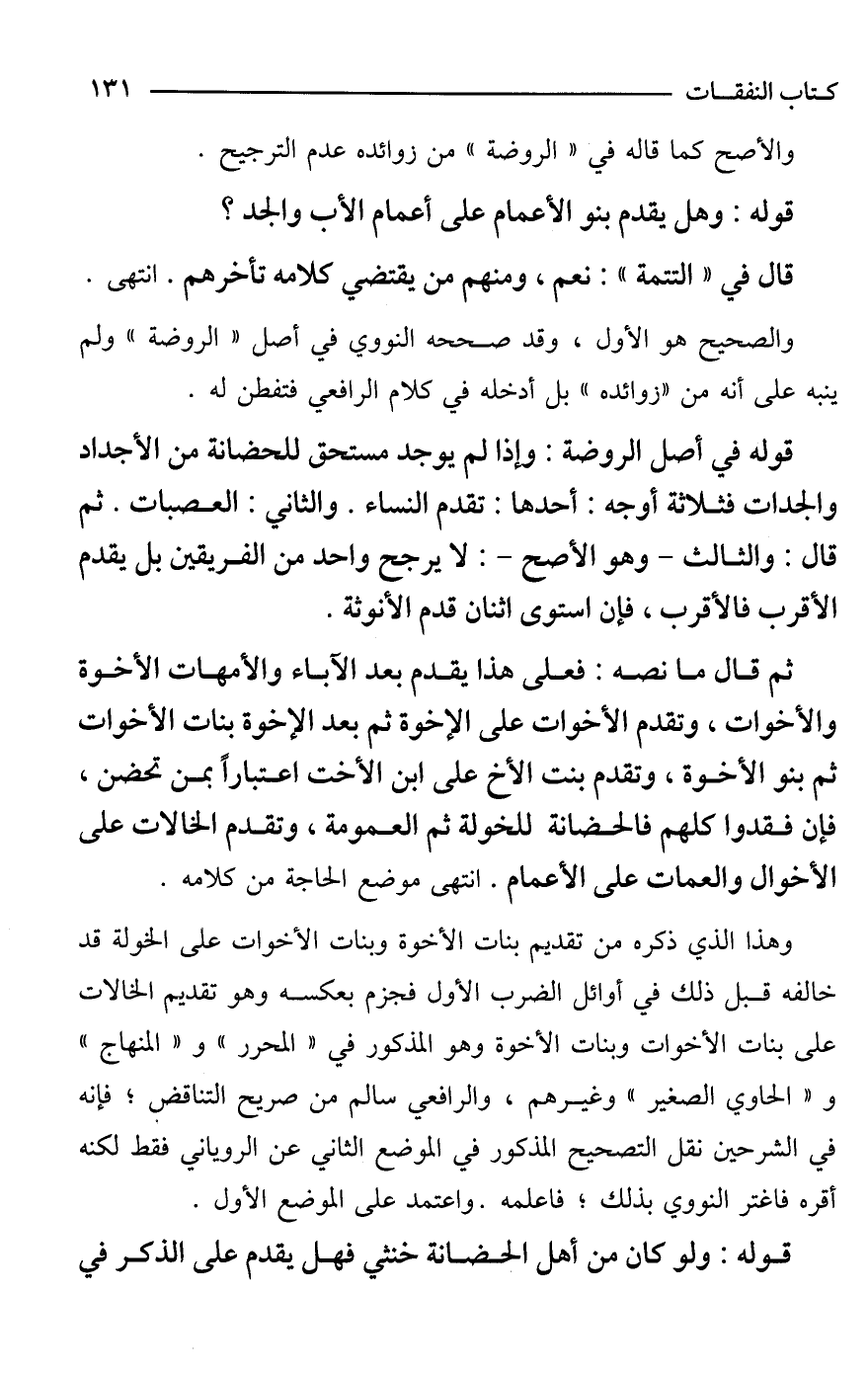 ثم قال ما نصه: فعلى هذا يقدم بعد الآباء والأمهات الأخوة والأخوات، وتقدم الأخوات على الأخوة ثم بعد الإخوة بنات الأخوات ثم بنو الأخوة، وتقدم بنت الأخ على ابن الأخت اعتبارًا بمن تحضن، فإن فقدوا كلهم فالحضانة للخولة ثم العمومة، وتقدم الخالات على الأخوال والعمات على الأعمام. انتهى موضع الحاجة من كلامه.