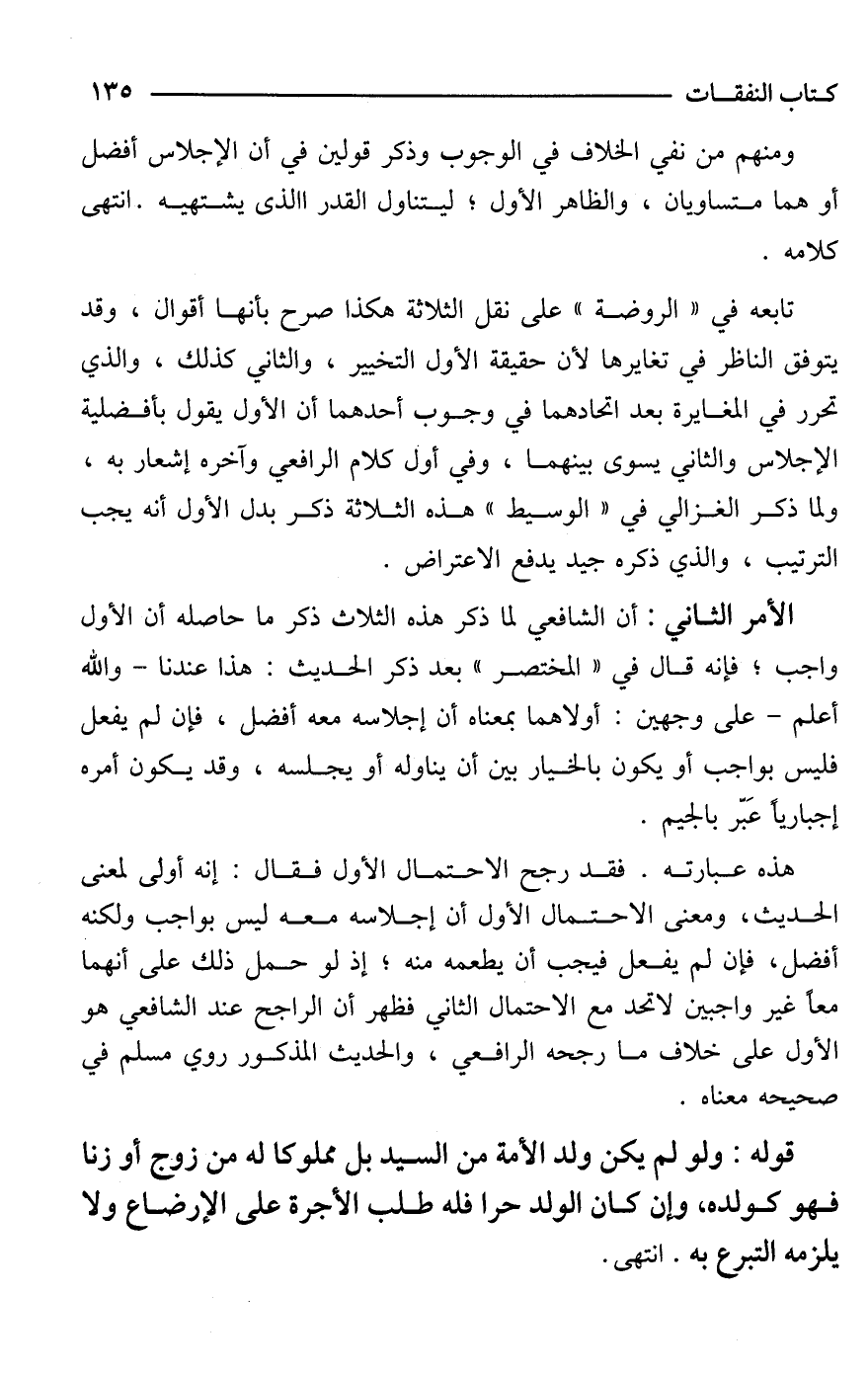 هذه عبارته. فقد رجح الاحتمال الأول فقال: إنه أولى لمعنى الحديث، ومعنى الاحتمال الأول أن إجلاسه معه ليس بواجب ولكنه أفضل، فإن لم يفعل فيجب أن يطعمه منه؛ إذ لو حمل ذلك على أنهما معًا غير واجبين لاتحد مع الاحتمال الثاني فظهر أن الراجح عند الشافعي هو الأول على خلاف ما رجحه الرافعي، والحديث المذكور روي مسلم في صحيحه معناه.