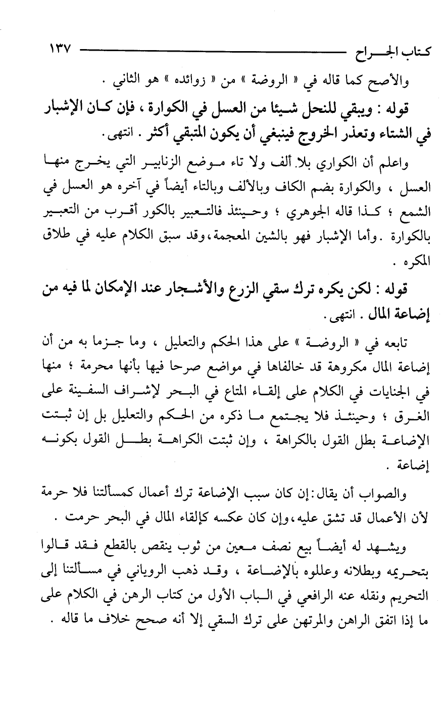 واعلم أن الكواري بلا ألف ولا تاء موضع الزنابير التي يخرج منها العسل، والكوارة بضم الكاف وبالألف وبالتاء أيضًا في آخره هو العسل في الشمع؛ كذا قاله الجوهري؛ وحينئذ فالتعبير بالكور أقرب من التعبير بالكوارة. وأما الإشبار فهو بالشين المعجمة، وقد سبق الكلام عليه في طلاق المكره.