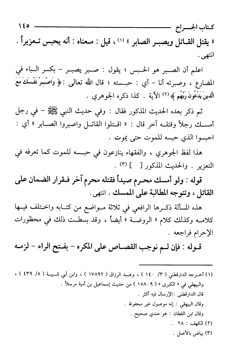 ثم ذكر بعده الحديث المذكور فقال: وفي حديث النبي - صَلَّى اللَّهُ عَلَيْهِ وَسَلَّمَ - في رجل أمسك رجلًا وقتله آخر قال: "اقتلوا القاتل واصبروا الصابر" أي: احبسوا الذي حبسه للموت حتى يموت.