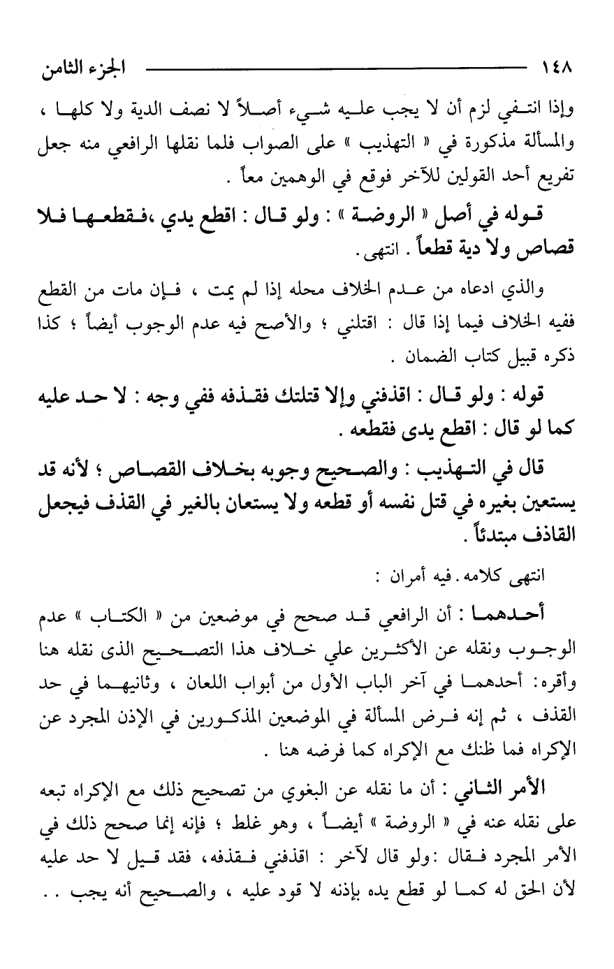 أحدهما: أن الرافعي قد صحح في موضعين من "الكتاب" عدم الوجوب ونقله عن الأكثرين علي خلاف هذا التصحيح الذى نقله هنا وأقره: أحدهما في آخر الباب الأول من أبواب اللعان، وثانيهما في حد القذف، ثم إنه فرض المسألة في الموضعين المذكورين في الإذن المجرد عن الإكراه فما ظنك مع الإكراه كما فرضه هنا.
