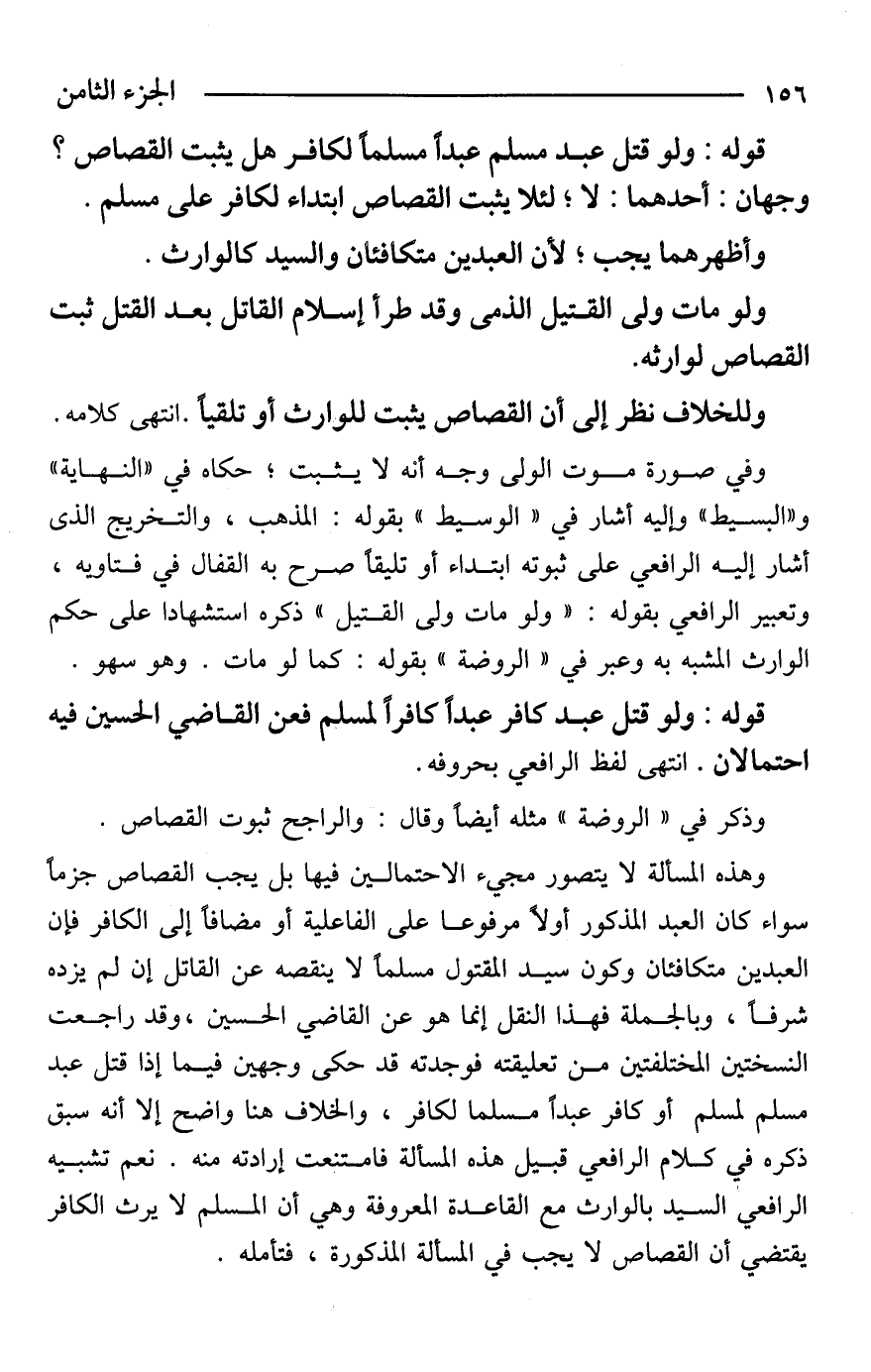 وهذه المسألة لا يتصور مجيء الاحتمالين فيها بل يجب القصاص جزمًا سواء كان العبد المذكور أولًا مرفوعا على الفاعلية أو مضافًا إلى الكافر فإن العبدين متكافئان وكون سيد المقتول مسلمًا لا ينقصه عن القاتل إن لم يزده شرفًا، وبالجملة فهذا النقل إنما هو عن القاضي الحسين، وقد راجعت النسختين المختلفتين من تعليقته فوجدته قد حكى وجهين فيما إذا قتل عبد مسلم لمسلم أو كافر عبدًا مسلما لكافر، والخلاف هنا واضح إلا أنه سبق ذكره في كلام الرافعي قبيل هذه المسألة فامتنعت إرادته منه. نعم تشبيه الرافعي السيد بالوارث مع القاعدة المعروفة وهي أن المسلم لا يرث الكافر يقتضي أن القصاص لا يجب في المسألة المذكورة، فتأمله.