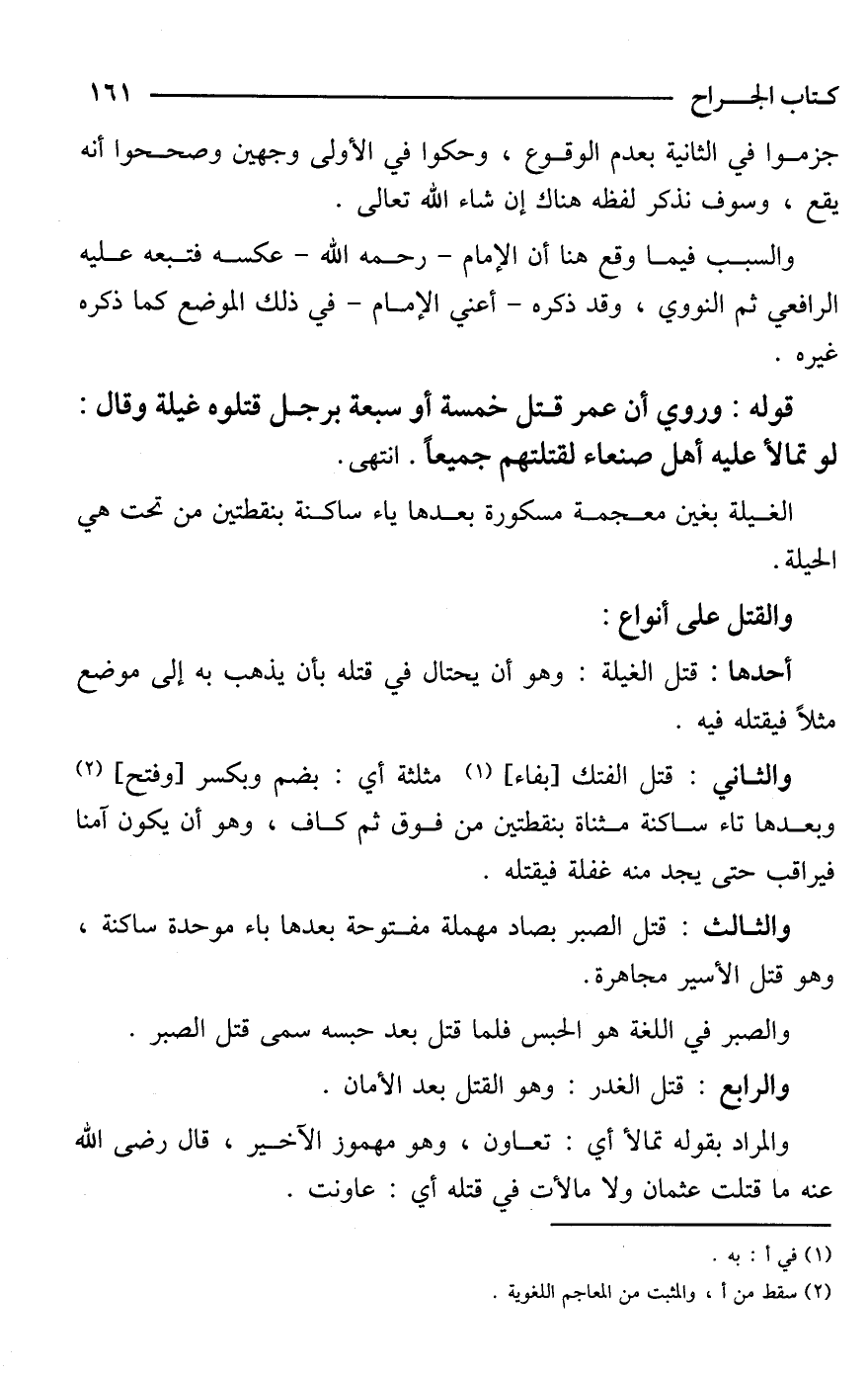 والثاني: قتل الفتك [بفاء] (¬1) مثلثة أي: بضم وبكسر [وفتح] (¬2) وبعدها تاء ساكنة مثناة بنقطتين من فوق ثم كاف، وهو أن يكون آمنا فيراقب حتى يجد منه غفلة فيقتله.