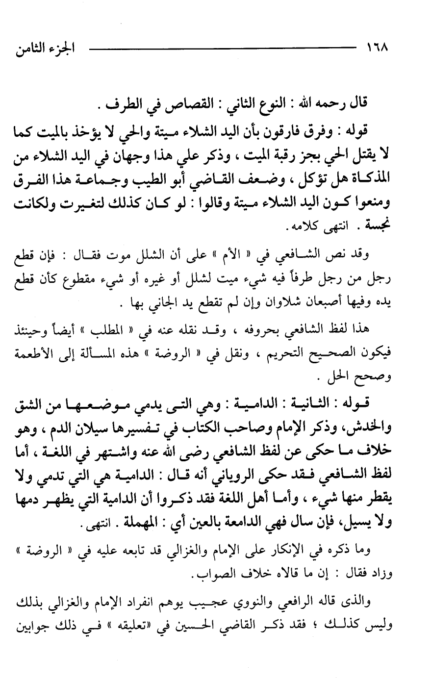 قوله: وفرق فارقون بأن اليد الشلاء ميتة والحي لا يؤخذ بالميت كما لا يقتل الحي بجز رقبة الميت، وذكر علي هذا وجهان في اليد الشلاء من المذكاة هل تؤكل، وضعف القاضي أبو الطيب وجماعة هذا الفرق ومنعوا كون اليد الشلاء ميتة وقالوا: لو كان كذلك لتغيرت ولكانت نجسة. انتهى كلامه.