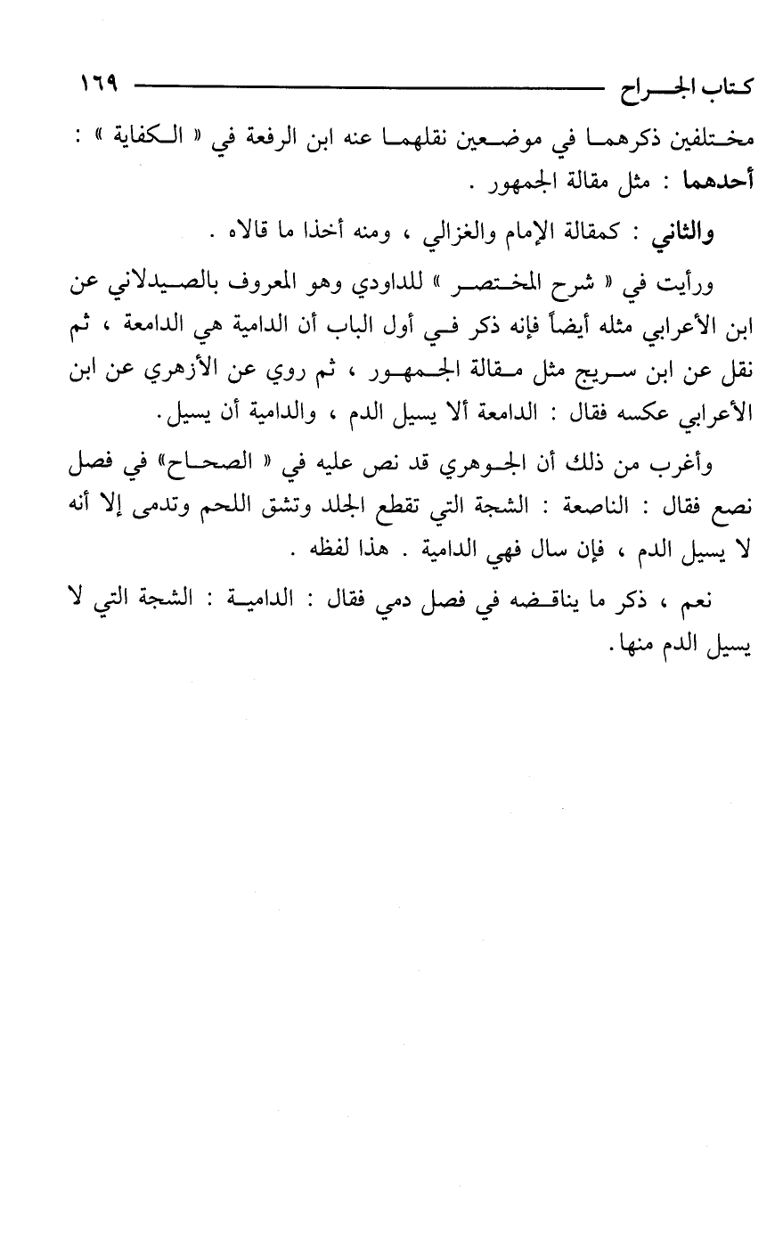 ورأيت في "شرح المختصر" للداودي وهو المعروف بالصيدلاني عن ابن الأعرابي مثله أيضًا فإنه ذكر في أول الباب أن الدامية هي الدامعة، ثم نقل عن ابن سريج مثل مقالة الجمهور، ثم روي عن الأزهري عن ابن الأعرابي عكسه فقال: الدامعة ألا يسيل الدم، والدامية أن يسيل.