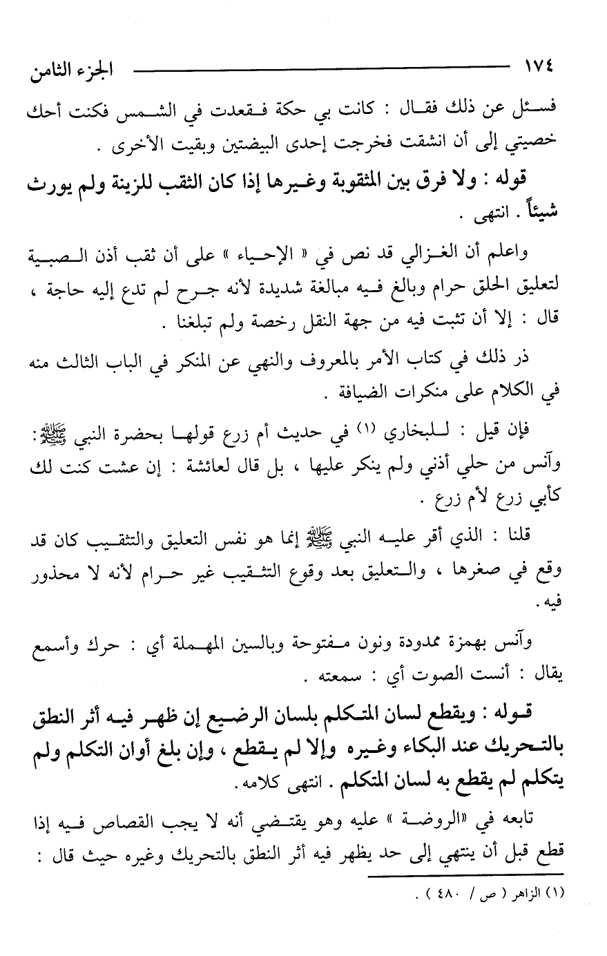 واعلم أن الغزالي قد نص في "الإحياء" على أن ثقب أذن الصبية لتعليق الحلق حرام وبالغ فيه مبالغة شديدة لأنه جرح لم تدع إليه حاجة، قال: إلا أن تثبت فيه من جهة النقل رخصة ولم تبلغنا.