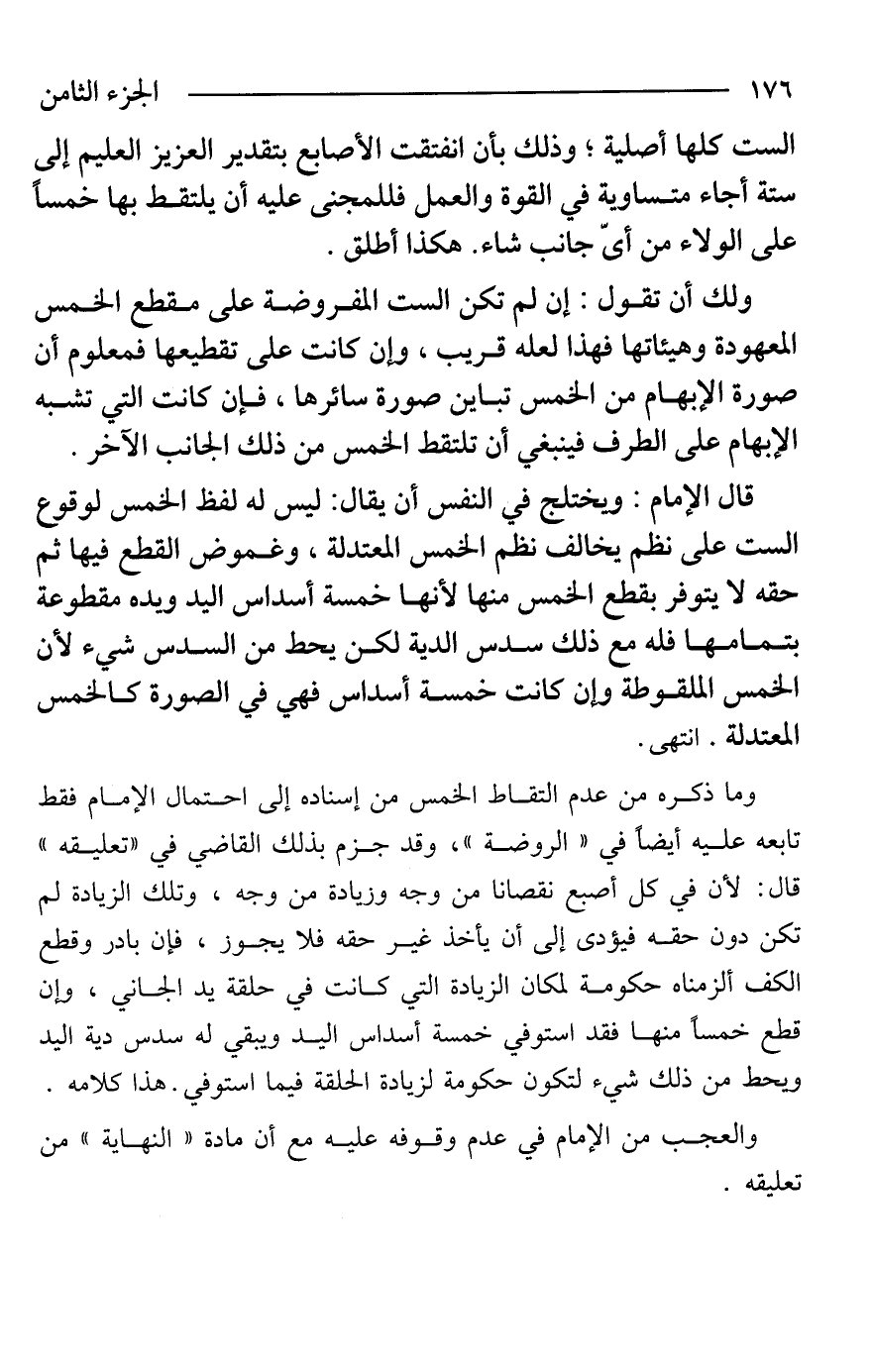 وما ذكره من عدم التقاط الخمس من إسناده إلى احتمال الإمام فقط تابعه عليه أيضًا في "الروضة"، وقد جزم بذلك القاضي في "تعليقه" قال: لأن في كل أصبع نقصانا من وجه وزيادة من وجه، وتلك الزيادة لم تكن دون حقه فيؤدى إلى أن يأخذ غير حقه فلا يجوز، فإن بادر وقطع الكف ألزمناه حكومة لمكان الزيادة التي كانت في حلقة يد الجاني، وإن قطع خمسًا منها فقد استوفي خمسة أسداس اليد ويبقي له سدس دية اليد ويحط من ذلك شيء لتكون حكومة لزيادة الحلقة فيما استوفي. هذا كلامه.