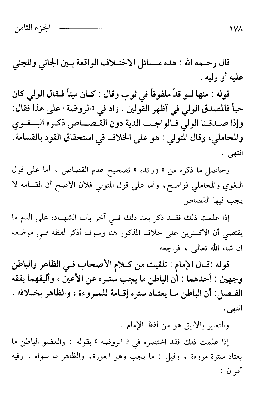 قوله: قال الإمام: تلقيت من كلام الأصحاب في الظاهر والباطن وجهين: أحدهما: أن الباطن ما يجب ستره عن الأعين، وأليقهما بفقه الفصل: أن الباطن ما يعتاد ستره إقامة للمروءة، والظاهر بخلافه. انتهى.
