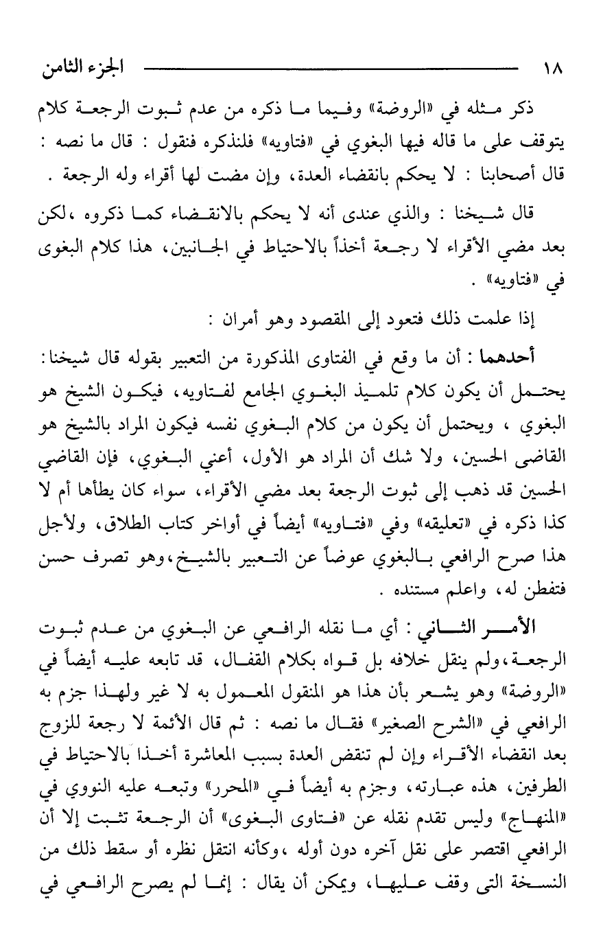 الأمر الثاني: أي ما نقله الرافعي عن البغوي من عدم ثبوت الرجعة، ولم ينقل خلافه بل قواه بكلام القفال، قد تابعه عليه أيضًا في "الروضة" وهو يشعر بأن هذا هو المنقول المعمول به لا غير ولهذا جزم به الرافعي في "الشرح الصغير" فقال ما نصه: ثم قال الأئمة لا رجعة للزوج بعد انقضاء الأقراء وإن لم تنقض العدة بسبب المعاشرة أخذًا بالاحتياط في الطرفين، هذه عبارته، وجزم به أيضًا في "المحرر" وتبعه عليه النووي في "المنهاج" وليس تقدم نقله عن "فتاوى البغوى" أن الرجعة تثبت إلا أن الرافعي اقتصر على نقل آخره دون أوله، وكأنه انتقل نظره أو سقط ذلك من النسخة التى وقف عليها، ويمكن أن يقال: إنما لم يصرح الرافعي في