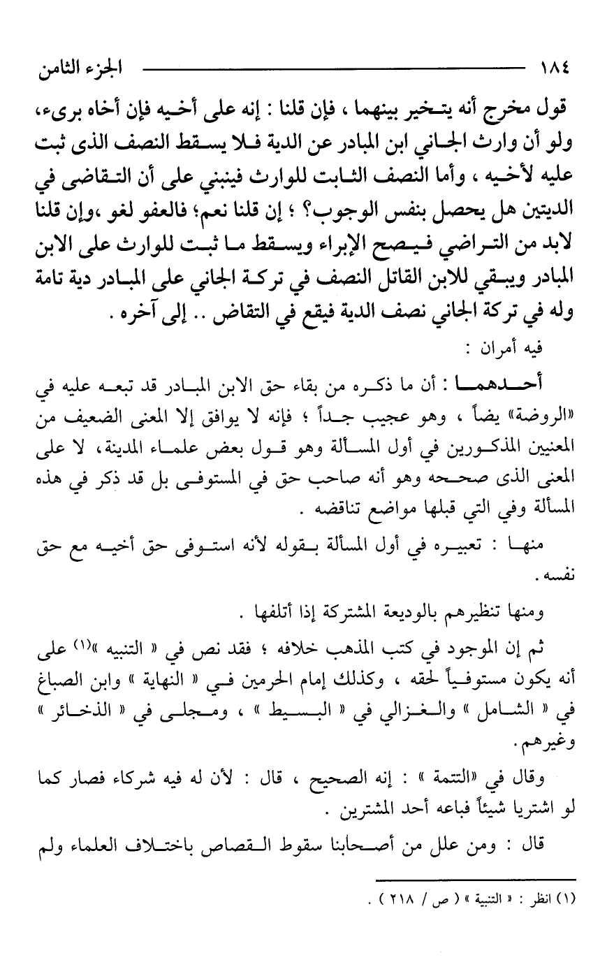 قول مخرج أنه يتخير بينهما، فإن قلنا: إنه على أخيه فإن أخاه برئ، ولو أن وارث الجاني ابن المبادر عن الدية فلا يسقط النصف الذى ثبت عليه لأخيه، وأما النصف الثابت للوارث فينبني على أن التقاضى في الديتين هل يحصل بنفس الوجوب؟ ؛ إن قلنا نعم؛ فالعفو لغو، وإن قلنا لابد من التراضي فيصح الإبراء ويسقط ما ثبت للوارث على الابن المبادر ويبقي للابن القاتل النصف في تركة الجاني على المبادر دية تامة وله في تركة الجاني نصف الدية فيقع في التقاض .. إلى آخره.