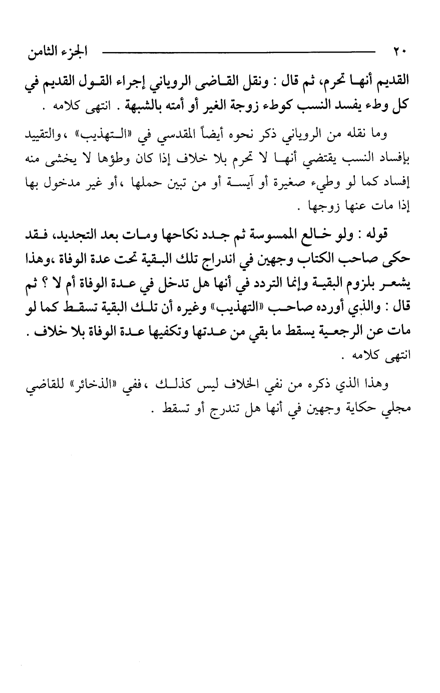 قوله: ولو خالع الممسوسة ثم جدد نكاحها ومات بعد التجديد، فقد حكى صاحب الكتاب وجهين في اندراج تلك البقية تحت عدة الوفاة، وهذا يشعر بلزوم البقية وإنما التردد في أنها هل تدخل في عدة الوفاة أم لا؟ ثم قال: والذي أورده صاحب "التهذيب" وغيره أن تلك البقية تسقط كما لو مات عن الرجعية يسقط ما بقي من عدتها وتكفيها عدة الوفاة بلا خلاف. انتهى كلامه.