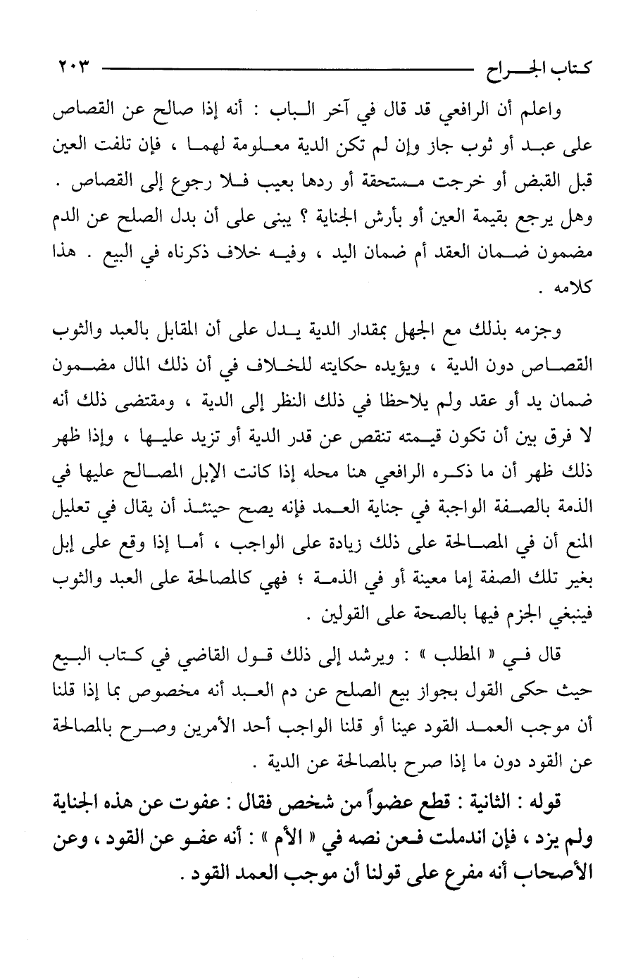 وجزمه بذلك مع الجهل بمقدار الدية يدل على أن المقابل بالعبد والثوب القصاص دون الدية، ويؤيده حكايته للخلاف في أن ذلك المال مضمون ضمان يد أو عقد ولم يلاحظا في ذلك النظر إلى الدية، ومقتضى ذلك أنه لا فرق بين أن تكون قيمته تنقص عن قدر الدية أو تزيد عليها، وإذا ظهر ذلك ظهر أن ما ذكره الرافعي هنا محله إذا كانت الإبل المصالح عليها في الذمة بالصفة الواجبة في جناية العمد فإنه يصح حينئذ أن يقال في تعليل المنع أن في المصالحة على ذلك زيادة على الواجب، أما إذا وقع على إبل بغير تلك الصفة إما معينة أو في الذمة؛ فهي كالمصالحة على العبد والثوب فينبغي الجزم فيها بالصحة على القولين.