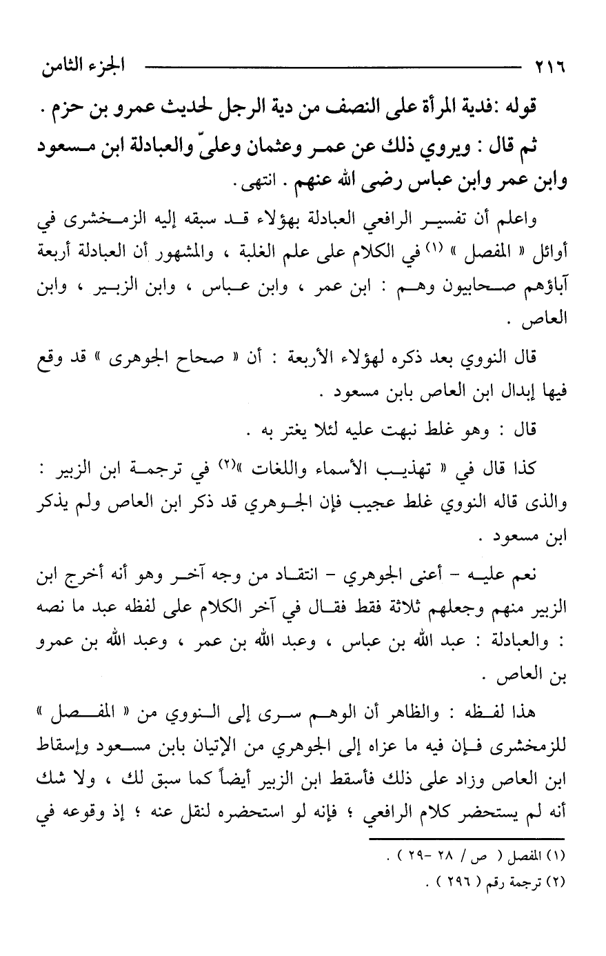 هذا لفظه: والظاهر أن الوهم سرى إلى النووي من "المفصل" للزمخشرى فإن فيه ما عزاه إلى الجوهري من الإتيان بابن مسعود وإسقاط ابن العاص وزاد على ذلك فأسقط ابن الزبير أيضًا كما سبق لك، ولا شك أنه لم يستحضر كلام الرافعي؛ فإنه لو استحضره لنقل عنه؛ إذ وقوعه في