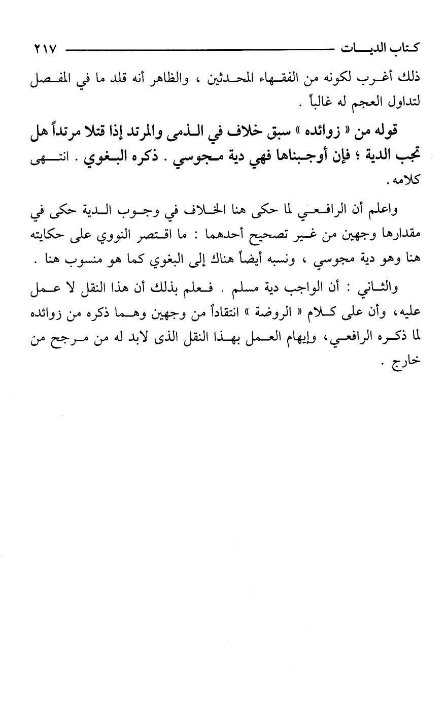 قوله من "زوائده" سبق خلاف في الذمى والمرتد إذا قتلا مرتدًا هل تجب الدية؛ فإن أوجبناها فهي دية مجوسي. ذكره البغوي. انتهى كلامه.