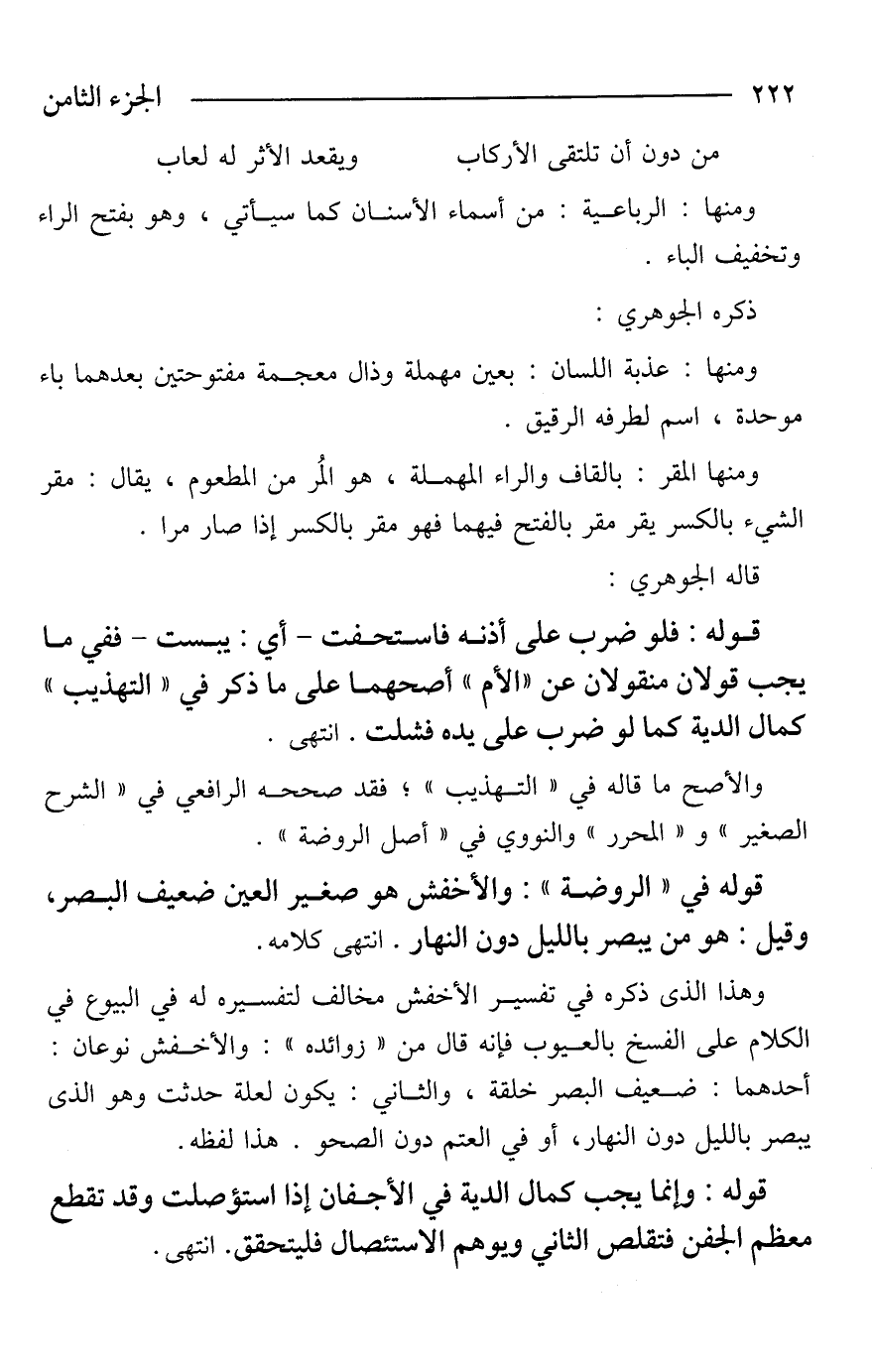 وهذا الذى ذكره في تفسير الأخفش مخالف لتفسيره له في البيوع في الكلام على الفسخ بالعيوب فإنه قال من "زوائده": والأخفش نوعان: أحدهما: ضعيف البصر خلقة، والثاني: يكون لعلة حدثت وهو الذى يبصر بالليل دون النهار، أو في العتم دون الصحو. هذا لفظه.