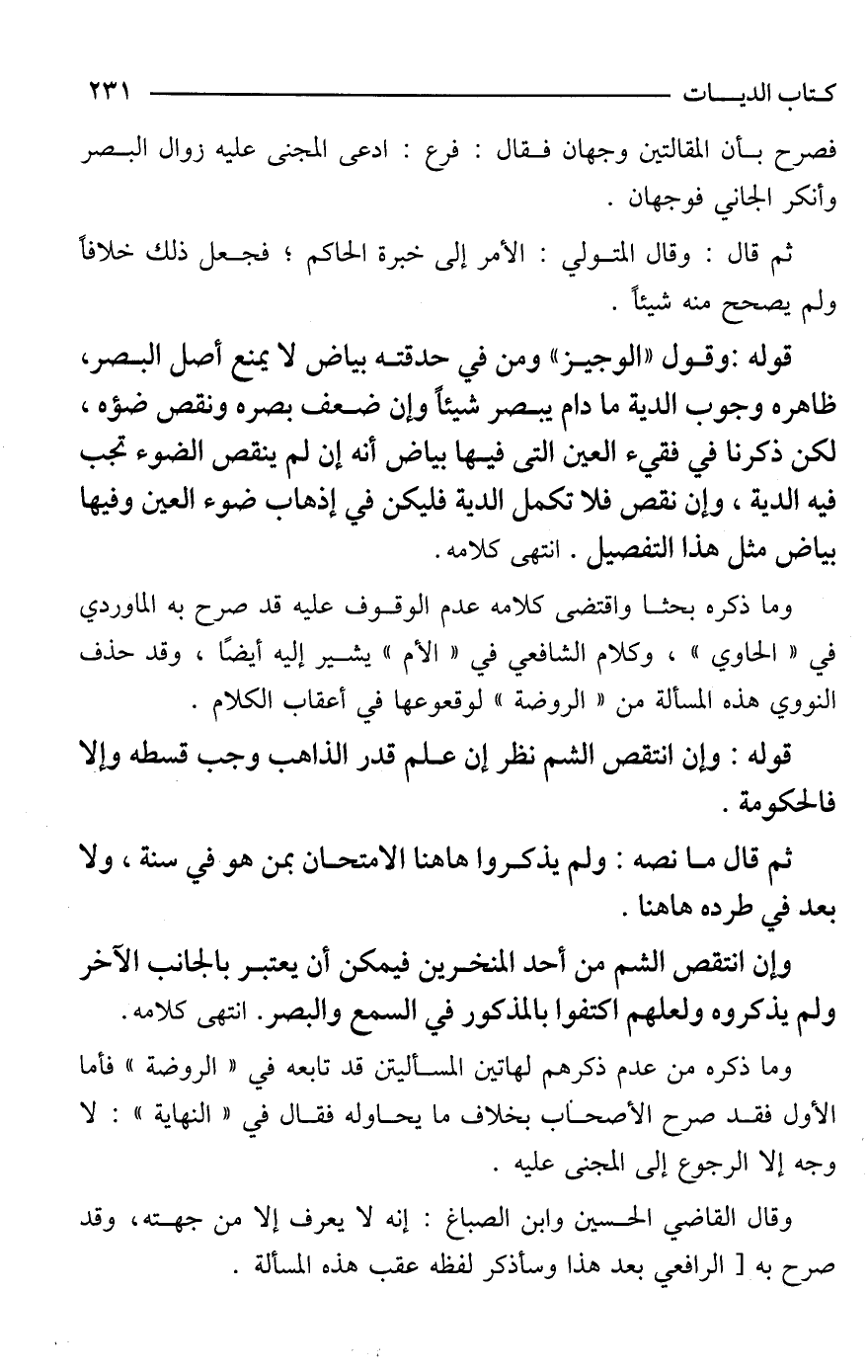 قوله: وقول "الوجيز" ومن في حدقته بياض لا يمنع أصل البصر، ظاهره وجوب الدية مادام يبصر شيئًا وإن ضعف بصره ونقص [ضوؤه]، لكن ذكرنا في [فقئ] العين التى فيها بياض أنه إن لم ينقص الضوء تجب فيه الدية، وإن نقص فلا تكمل الدية فليكن في إذهاب ضوء العين وفيها بياض مثل هذا التفصيل. انتهى كلامه.
