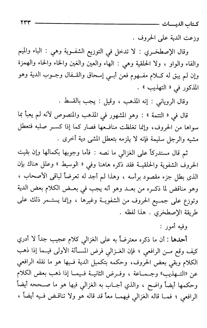 ثم قال مستدركًا على الغزالي ما نصه: فأما وجوبها بكمالها وإن بقيت الحروف الشفوية والحلقية فقد ذكره هاهنا وفي "الوسيط" وعلل هناك [بأن] الذى بطل جزء مقصود برأسه، وهذا لم أجد له تعرضًا لباقى الأصحاب، وهو مناقض لما ذكره من بعد وهو أنه يجب في بعض الكلام بعض الدية وتوزع على جميع الحروف من الشفوية وغيرها، وإنما يستمر ذلك على طريقة الإصطخري. هذا لفظه.