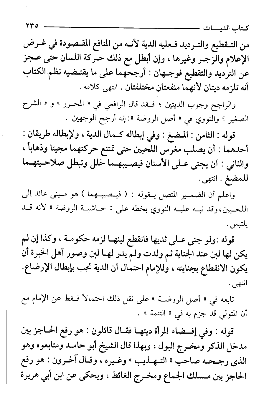 من التقطيع والترديد فعليه الدية لأنه من المنافع المقصودة في غرض الإعلام والزجر وغيرها، وإن أبطل مع ذلك حركة اللسان حتى عجز عن الترديد والتقطيع فوجهان: أرجحهما على ما يقتضيه نظم الكتاب أنه تلزمه ديتان لأنهما منفعتان مختلفتان. انتهى كلامه.
