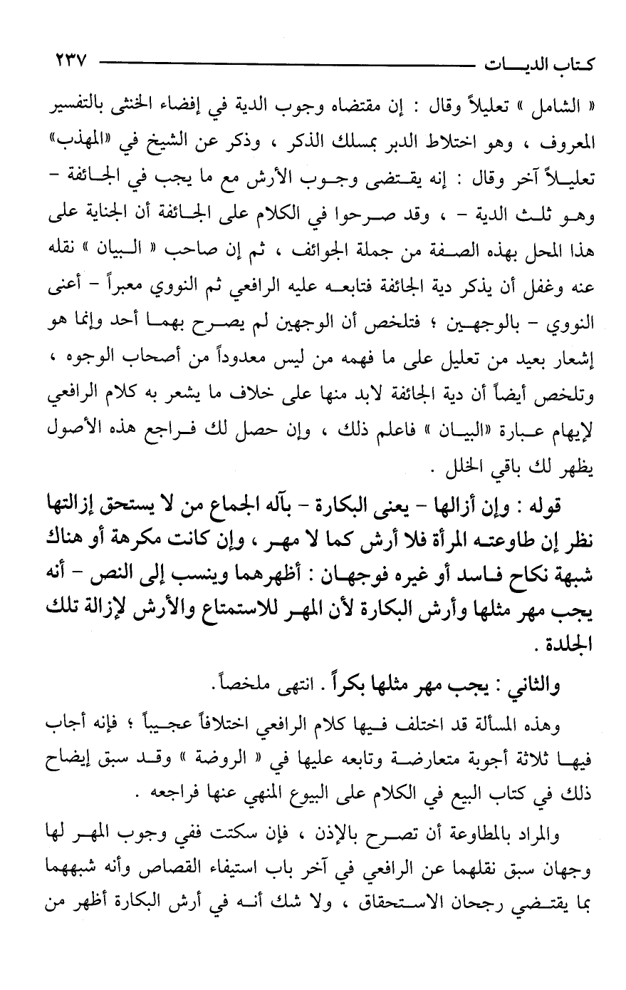 "الشامل" تعليلًا وقال: إن مقتضاه وجوب الدية في إفضاء الخنثى بالتفسير المعروف، وهو اختلاط الدبر بمسلك الذكر، وذكر عن الشيخ في "المهذب" تعليلًا آخر وقال: إنه يقتضى وجوب الأرش مع ما يجب في الجائفة -وهو ثلث الدية-، وقد صرحوا في الكلام على الجائفة أن الجناية على هذا المحل بهذه الصفة من جملة الجوائف، ثم إن صاحب "البيان" نقله عنه وغفل أن يذكر دية الجائفة فتابعه عليه الرافعي ثم النووي معبرًا -أعنى النووي- بالوجهين، فتلخص أن الوجهين لم يصرح بهما أحد وإنما هو إشعار بعيد من تعليل على ما فهمه من ليس معدودًا من أصحاب الوجوه، وتلخص أيضًا أن دية الجائفة لابد منها على خلاف ما يشعر به كلام الرافعي لإيهام عبارة "البيان" فاعلم ذلك، وإن حصل لك فراجع هذه الأصول يظهر لك باقي الخلل.