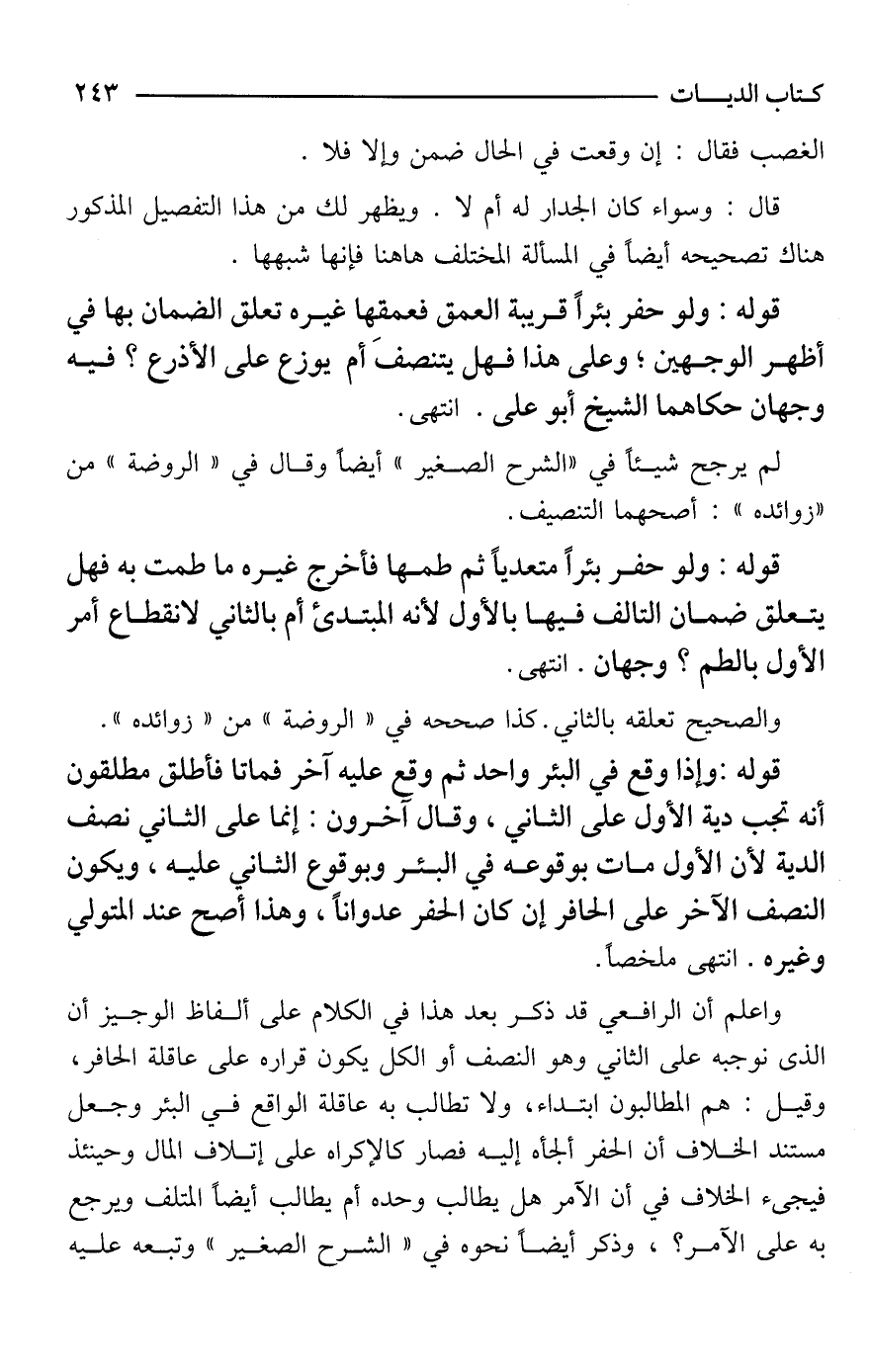 قوله: ولو حفر بئرًا قريبة العمق فعمقها غيره تعلق الضمان بها في أظهر الوجهين؛ وعلى هذا فهل يتنصف أم يوزع على الأذرع؟ فيه وجهان حكاهما الشيخ أبو على. انتهى.