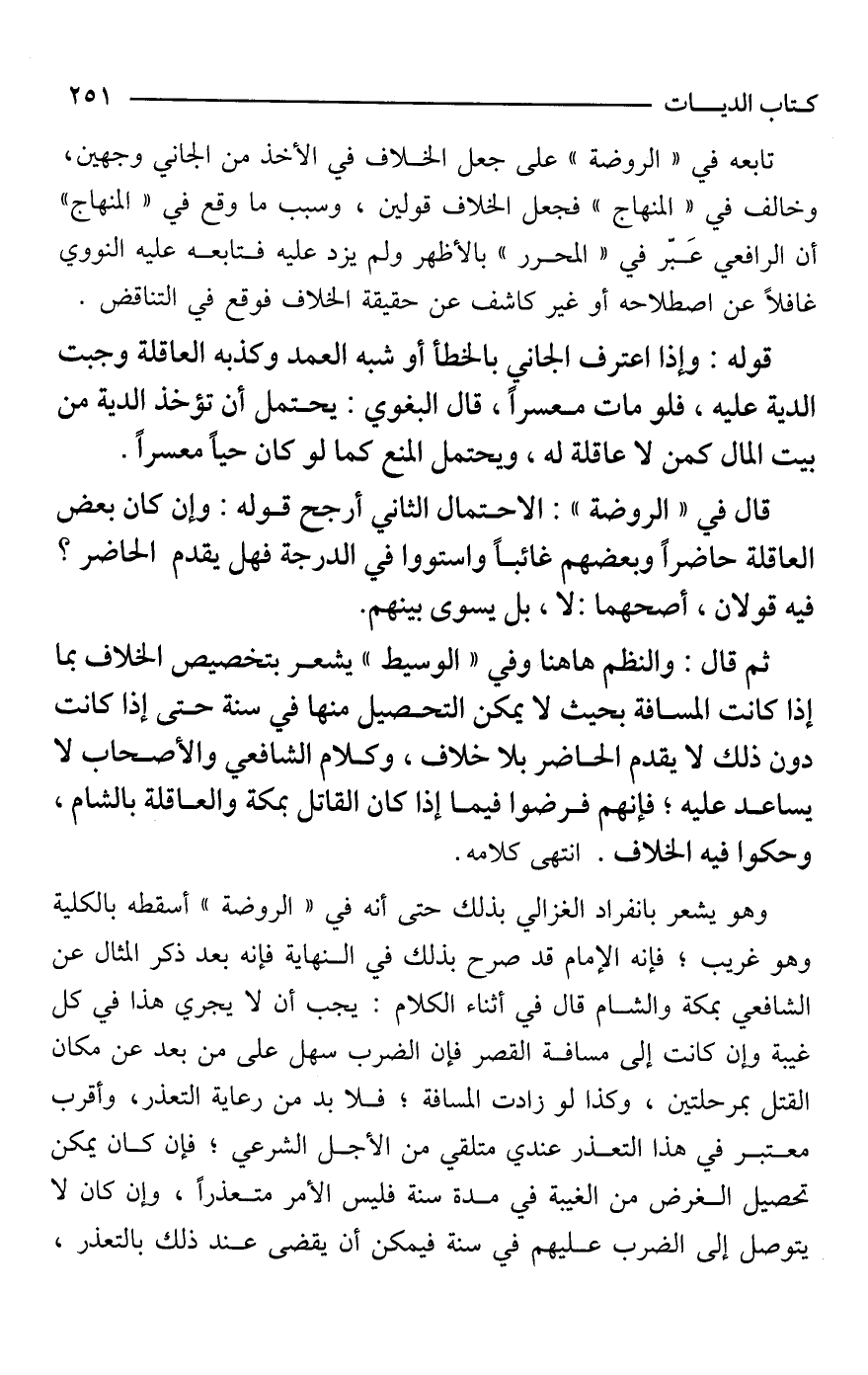 ثم قال: والنظم هاهنا وفي "الوسيط" يشعر بتخصيص الخلاف بما إذا كانت المسافة بحيث لا يمكن التحصيل منها في سنة حتى إذا كانت دون ذلك لا يقدم الحاضر بلا خلاف، وكلام الشافعي والأصحاب لا يساعد عليه؛ فإنهم فرضوا فيما إذا كان القاتل بمكة والعاقلة بالشام، وحكوا فيه الخلاف. انتهى كلامه.