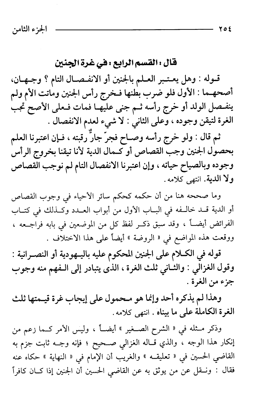 قوله في الكلام على الجنين المحكوم عليه باليهودية أو النصرانية: وقول الغزالي: والثاني ثلث الغرة، الذى يتبادر إلى الفهم منه وجوب جزء من الغرة.