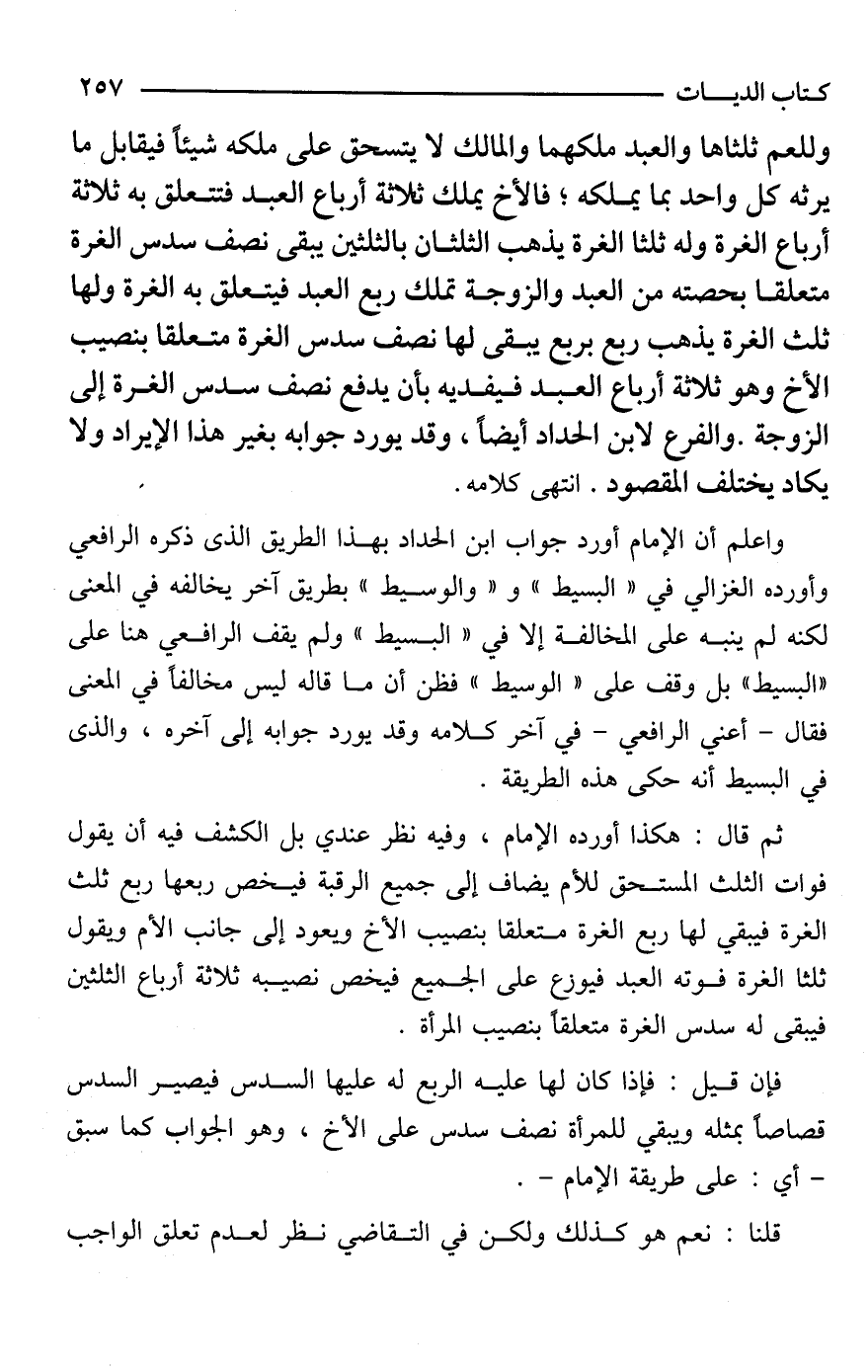 وللعم ثلثاها والعبد ملكهما والمالك لا [يستحق] على ملكه شيئًا فيقابل ما يرثه كل واحد بما يملكه؛ فالأخ يملك ثلاثة أرباع العبد فتتعلق به ثلاثة أرباع الغرة وله ثلثا الغرة يذهب الثلثان بالثلثين يبقى نصف سدس الغرة متعلقا بحصته من العبد والزوجة تملك ربع العبد فيتعلق به الغرة ولها ثلث الغرة يذهب ربع بربع يبقى لها نصف سدس الغرة متعلقا بنصيب الأخ وهو ثلاثة أرباع العبد فيفديه بأن يدفع نصف سدس الغرة إلى الزوجة. والفرع لابن الحداد أيضًا، وقد يورد جوابه بغير هذا الإيراد ولا يكاد يختلف المقصود. انتهى كلامه.