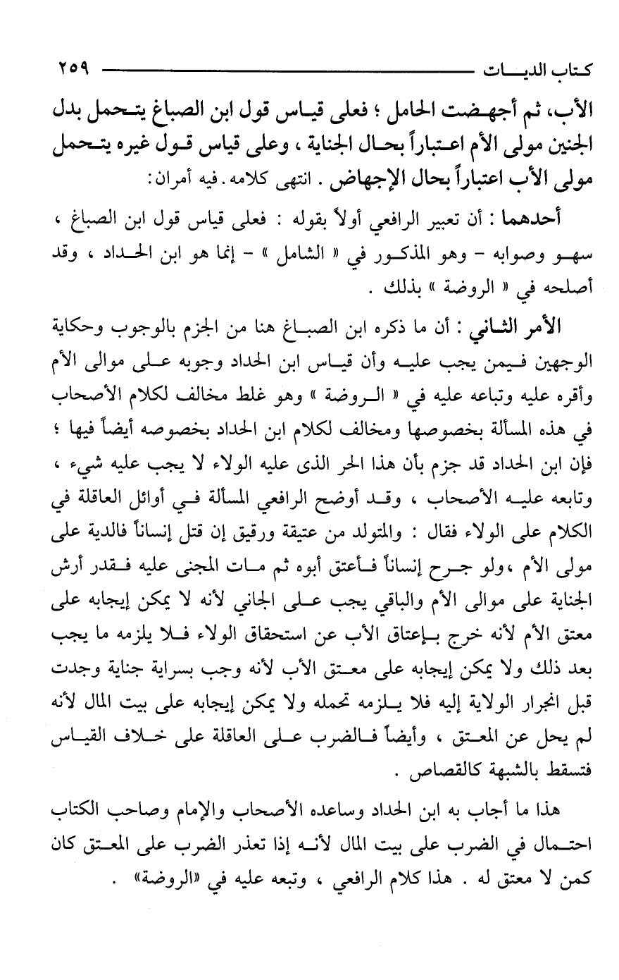 الأمر الثاني: أن ما ذكره ابن الصباغ هنا من الجزم بالوجوب وحكاية الوجهين فيمن يجب عليه وأن قياس ابن الحداد وجوبه على موالى الأم وأقره عليه [وتابعه] عليه في "الروضة" وهو غلط مخالف لكلام الأصحاب في هذه المسألة بخصوصها ومخالف لكلام ابن الحداد بخصوصه أيضًا فيها؛ فإن ابن الحداد قد جزم بأن هذا الحر الذى عليه الولاء لا يجب عليه شيء، وتابعه عليه الأصحاب، وقد أوضح الرافعي المسألة في أوائل العاقلة في الكلام على الولاء فقال: والمتولد من عتيقة ورقيق إن قتل إنسانًا فالدية على مولى الأم، ولو جرح إنسانًا فأعتق أبوه ثم مات المجنى عليه فقدر أرش الجناية على موالى الأم والباقي يجب على الجاني لأنه لا يمكن إيجابه على معتق الأم لأنه خرج بإعتاق الأب عن استحقاق الولاء فلا يلزمه ما يجب بعد ذلك ولا يمكن إيجابه على معتق الأب لأنه وجب بسراية جناية وجدت قبل انجرار الولاية إليه فلا يلزمه تحمله ولا يمكن إيجابه على بيت المال لأنه لم يحل عن المعتق، وأيضًا فالضرب على العاقلة على خلاف القياس فتسقط بالشبهة كالقصاص.
