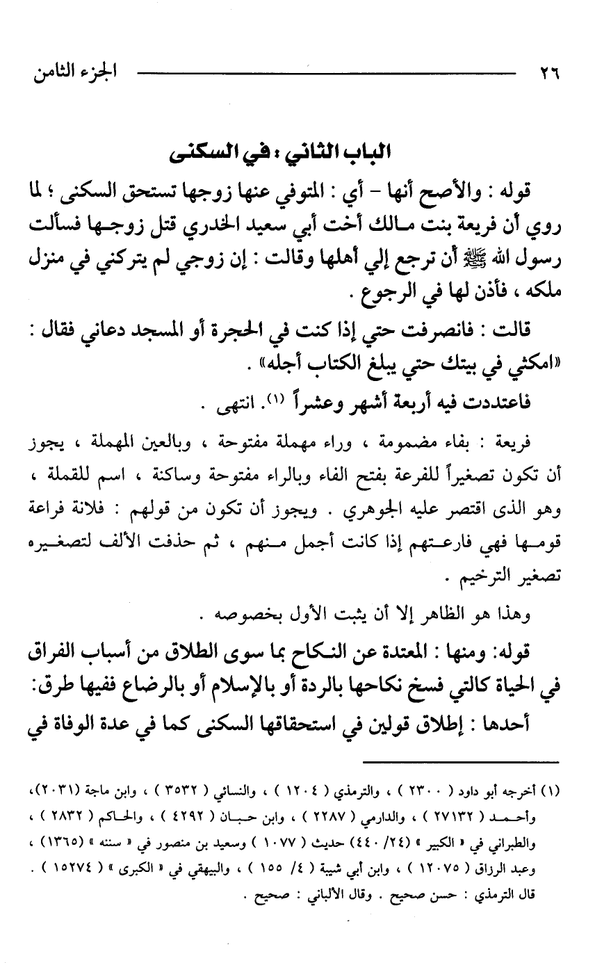 قالت: فانصرفت حتي إذا كنت في الحجرة أو المسجد دعانى فقال: "امكثي في بيتك حتي يبلغ الكتاب أجله".