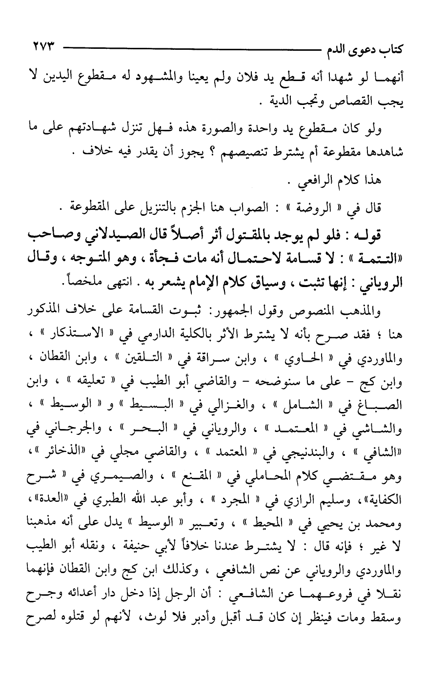 والمذهب المنصوص وقول الجمهور: ثبوت القسامة على خلاف المذكور هنا؛ فقد صرح بأنه لا يشترط الأثر بالكلية الدارمي في "الاستذكار"، والماوردي في "الحاوي"، وابن سراقة في "التلقين"، وابن القطان، وابن كج -على ما سنوضحه- والقاضي أبو الطيب في "تعليقه"، وابن الصباغ في "الشامل"، والغزالي في "البسيط" و"الوسيط"، والشاشي في "المعتمد"، والروياني في "البحر"، والجرجاني في "الشافي"، والبندنيجي في "المعتمد"، والقاضي مجلي في "الذخائر"، وهو مقتضي كلام المحاملي في "المقنع"، والصيمري في "شرح الكفاية"، وسليم الرازي في "المجرد"، وأبو عبد الله الطبري في "العدة"، ومحمد بن يحيي في "المحيط"، وتعبير "الوسيط" يدل على أنه مذهبنا لا غير؛ فإنه قال: لا يشترط عندنا خلافًا لأبي حنيفة، ونقله أبو الطيب والماوردي والروياني عن نص الشافعي، وكذلك ابن كج وابن القطان فإنهما نقلا في فروعهما عن الشافعي: أن الرجل إذا دخل دار أعدائه وجرح وسقط ومات فينظر إن كان قد أقبل وأدبر فلا لوث، لأنهم لو قتلوه لصرح