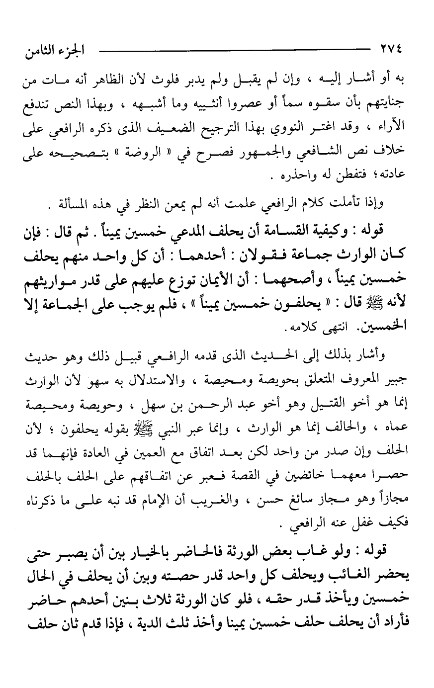 وأشار بذلك إلى الحديث الذى قدمه الرافعي قبيل ذلك وهو حديث جبير المعروف المتعلق بحويصة ومحيصة، والاستدلال به سهو لأن الوارث إنما هو أخو القتيل وهو أخو عبد الرحمن بن سهل، وحويصة ومحيصة عماه، والحالف إنما هو الوارث، وإنما عبر النبي - صَلَّى اللَّهُ عَلَيْهِ وَسَلَّمَ - بقوله يحلفون؛ لأن الحلف وإن صدر من واحد لكن بعد اتفاق مع العمين في العادة فإنهما قد حصرا معهما خائضين في القصة فعبر عن اتفاقهم على الحلف بالحلف مجازًا وهو مجاز سائغ حسن، والغريب أن الإمام قد نبه على ما ذكرناه فكيف غفل عنه الرافعي.