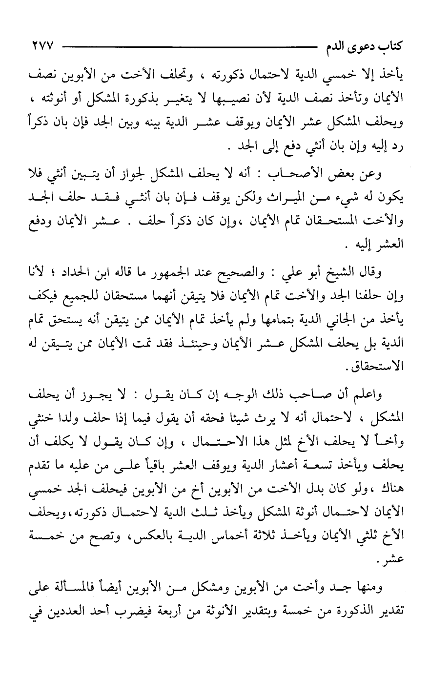 وقال الشيخ أبو علي: والصحيح عند الجمهور ما قاله ابن الحداد؛ لأنا وإن حلفنا الجد والأخت تمام الأيمان فلا يتيقن أنهما مستحقان للجميع [فكيف] يأخذ من الجاني الدية بتمامها ولم يأخذ تمام الأيمان ممن يتيقن أنه يستحق تمام الدية بل يحلف المشكل عشر الأيمان وحينئذ فقد تمت الأيمان ممن يتيقن له الاستحقاق.