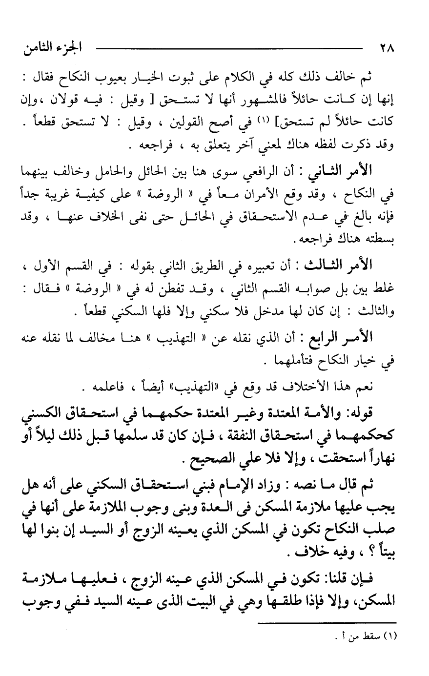 الأمر الثاني: أن الرافعي سوى هنا بين الحائل والحامل وخالف بينهما في النكاح، وقد وقع الأمران معًا في "الروضة" على كيفية غريبة جدًا فإنه بالغ في عدم الاستحقاق في الحائل حتى نفى الخلاف عنها، وقد بسطته هناك فراجعه.
