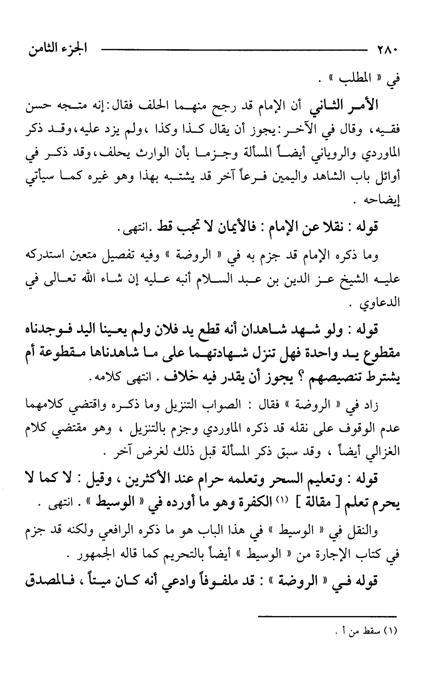 الأمر الثاني أن الإمام قد رجح منهما الحلف فقال: إنه متجه حسن فقيه، وقال في الآخر: يجوز أن يقال كذا وكذا، ولم يزد عليه، وقد ذكر الماوردي والروياني أيضًا المسألة وجزما بأن الوارث يحلف، وقد ذكر في أوائل باب الشاهد واليمين فرعًا آخر قد يشتبه بهذا وهو غيره كما سيأتي إيضاحه.