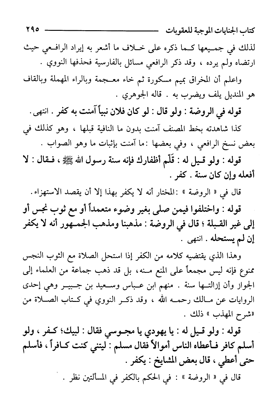 قوله: واختلفوا فيمن صلى بغير وضوء متعمدًا أو مع ثوب نجس أو إلى غير القبلة؛ قال في الروضة: مذهبنا ومذهب الجمهور أنه لا يكفر إن لم يستحله. انتهى.