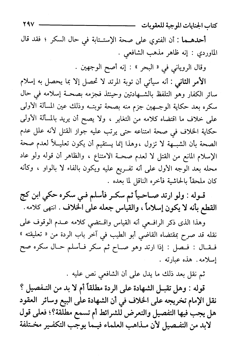 الأمر الثاني: أنه سيأتي أن توبة المرتد لا تحصل إلا بما يحصل به إسلام سائر الكفار وهو التلفظ بالشهادتين وحينئذ فجزمه بصحة إسلامه في حال سكره بعد حكاية الوجهين جزم منه بصحة توبته وذلك عين المسألة الأولى على خلاف ما اقتضاه كلامه من التغاير، ولا يصح أن يريد بالمسألة الأولى حكاية الخلاف في صحة امتناعه حتى يرتب عليه جواز القتل لأنه علل عدم الصحة بأن الشبهة لا تزول، وهذا إنما يستقيم أن يكون تعليلًا لعدم صحة الإسلام المانع من القتل لا لعدم صحة الامتناع، والظاهر أن قوله ولو عاد محله بعد الوجه الأول على أنه تفريع عليه ويكون بالفاء لا بالواو، وكأنه كان ملحقًا بالحاشية فأخره الناقل لما بعده.