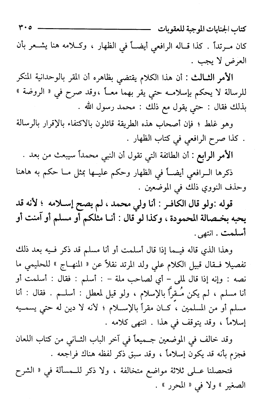 الأمر الثالث: أن هذا الكلام يقتضي بظاهره أن المقر بالوحدانية المنكر للرسالة لا يحكم بإسلامه حتي يقر بهما معًا، وقد صرح في "الروضة" بذلك فقال: حتي يقول مع ذلك: محمد رسول الله.