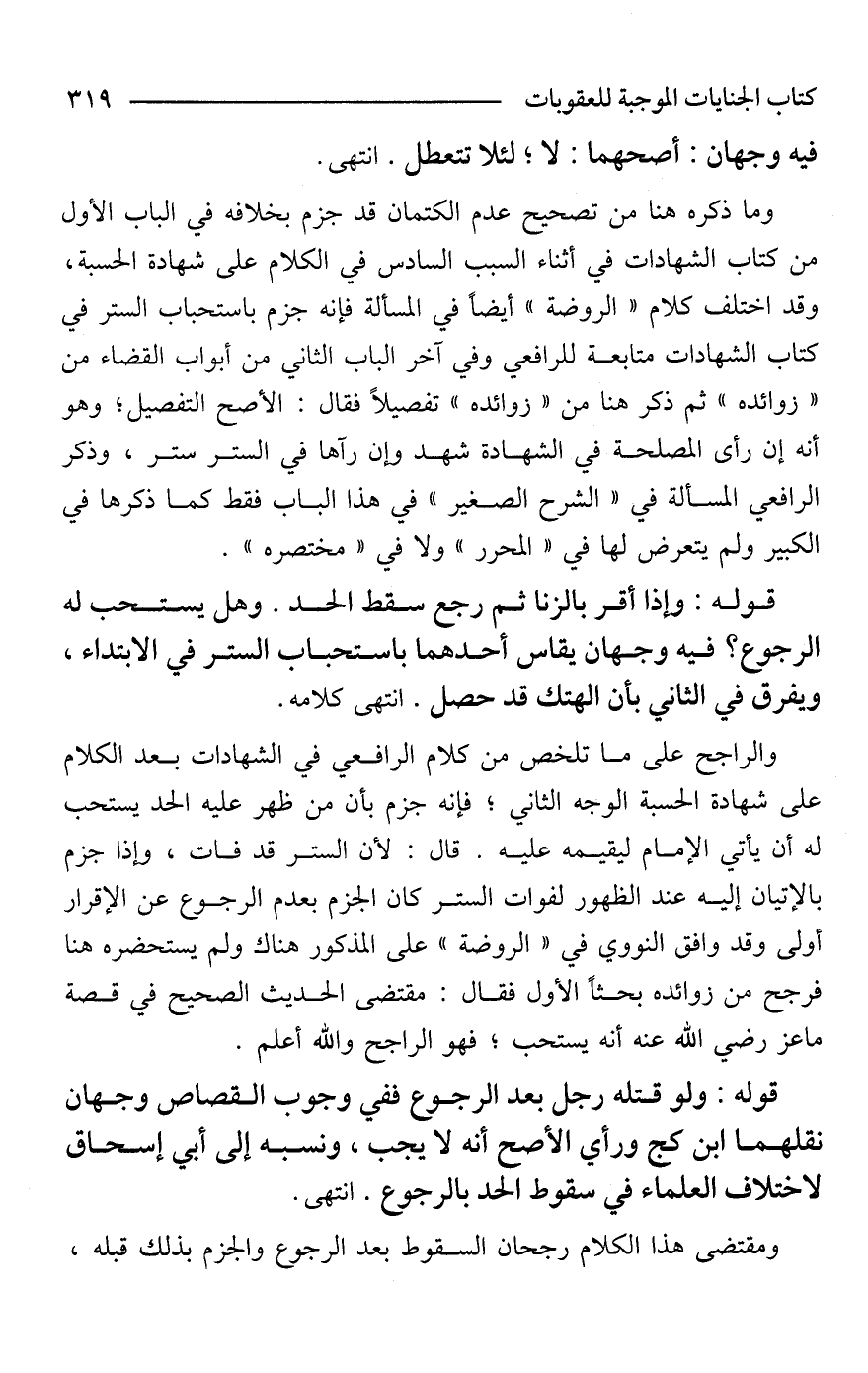 والراجح على ما تلخص من كلام الرافعي في الشهادات بعد الكلام على شهادة الحسبة الوجه الثاني؛ فإنه جزم بأن من ظهر عليه الحد يستحب له أن يأتي الإمام ليقيمه عليه. قال: لأن الستر قد فات، وإذا جزم بالإتيان إليه عند الظهور لفوات الستر كان الجزم بعدم الرجوع عن الإقرار أولى وقد وافق النووي في "الروضة" على المذكور هناك ولم يستحضره هنا فرجح من زوائده بحثًا الأول فقال: مقتضى الحديث الصحيح في قصة ماعز - رضي الله عنه - أنه يستحب؛ فهو الراجح والله أعلم.
