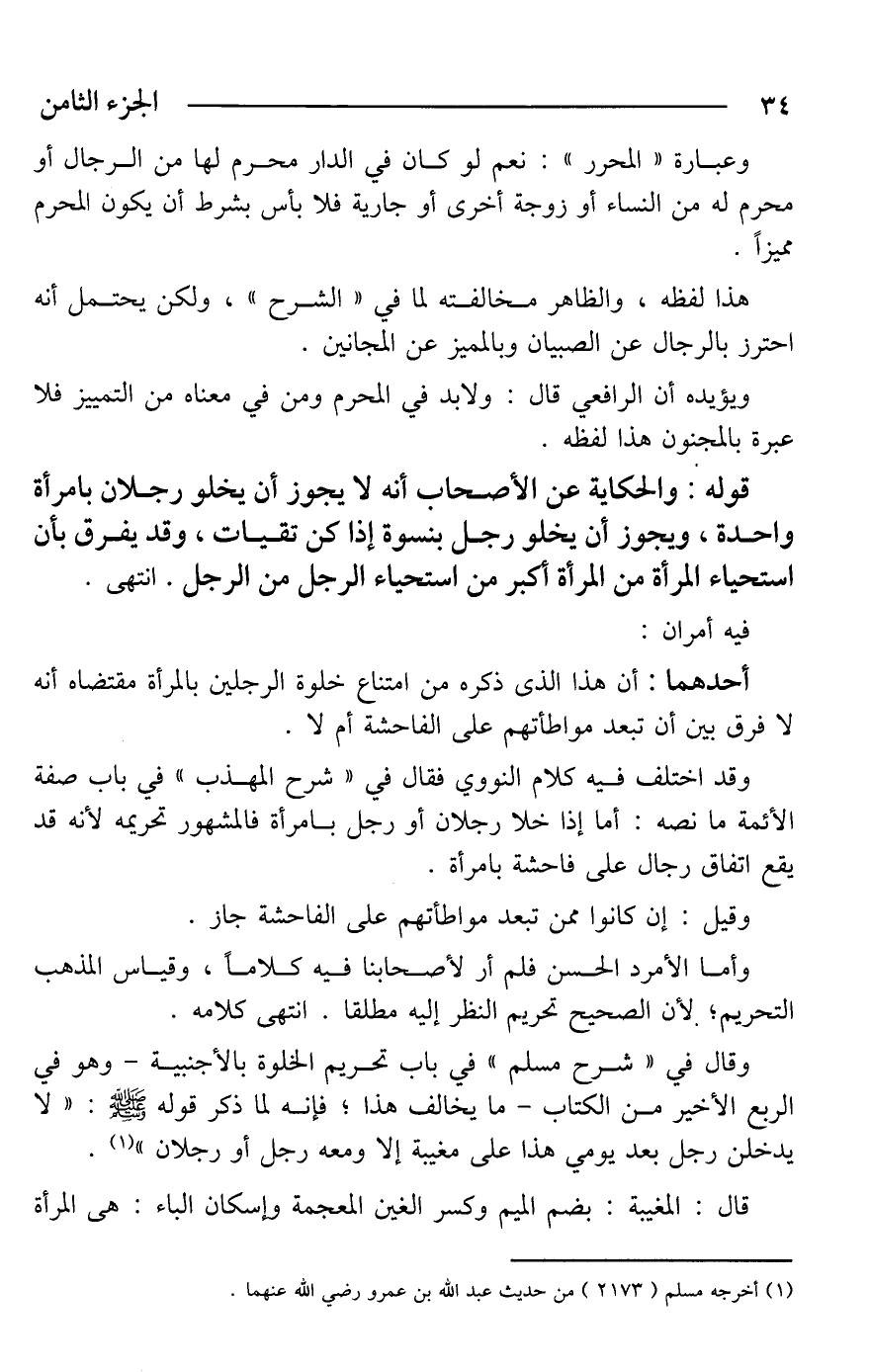 وقال في "شرح مسلم" في باب تحريم الخلوة بالأجنبية -وهو في الربع الأخير من الكتاب- ما يخالف هذا؛ فإنه لما ذكر قوله - صَلَّى اللَّهُ عَلَيْهِ وَسَلَّمَ -: "لا يدخلن رجل بعد يومي هذا على مغيبة إلا ومعه رجل أو رجلان" (¬1).