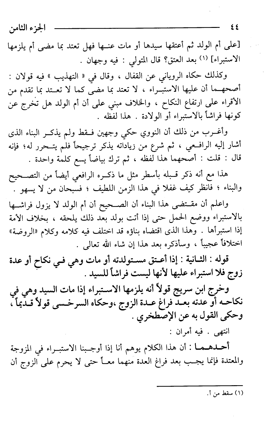 واعلم أن مقتضى هذا البناء أن الصحيح أن أم الولد لا يزول فراشها بالاستبراء ووضع الحمل حتى إذا أتت بولد بعد ذلك يلحقه، بخلاف الأمة إذا استبرأها. وهذا الذى اقتضاه بناؤه قد اختلف فيه كلامه وكلام "الروضة" اختلافًا عجيبًا، وسأذكره بعد هذا إن شاء الله تعالى.